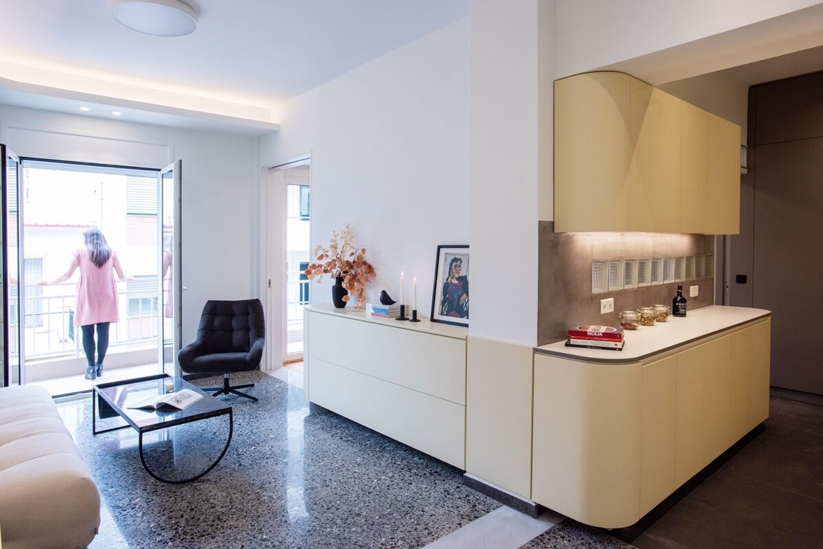 Το γραφείο BESSA+S ολοκλήρωσε την πλήρη ανακαίνιση ενός διαμερίσματος 50 τ.μ. σε μια πολυκατοικία του 1970 στο κέντρο της Αθήνας. Ο σχεδιασμός υλοποιεί την ιδέα μιας συνεχούς κίνησης η οποία διατρέχει τους χώρους, και αποτυπώνει την ανθρώπινη δραστηριότητα της διημέρευσης, στο κέντρο της οποίας τοποθετείται ο χώρος ύπνου, το κρεβάτι.