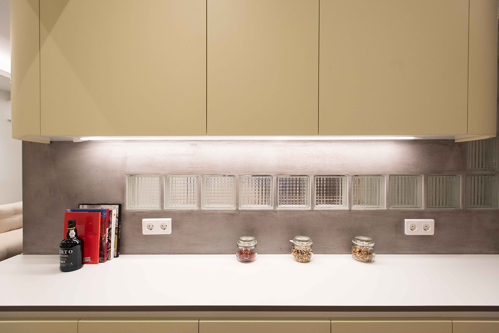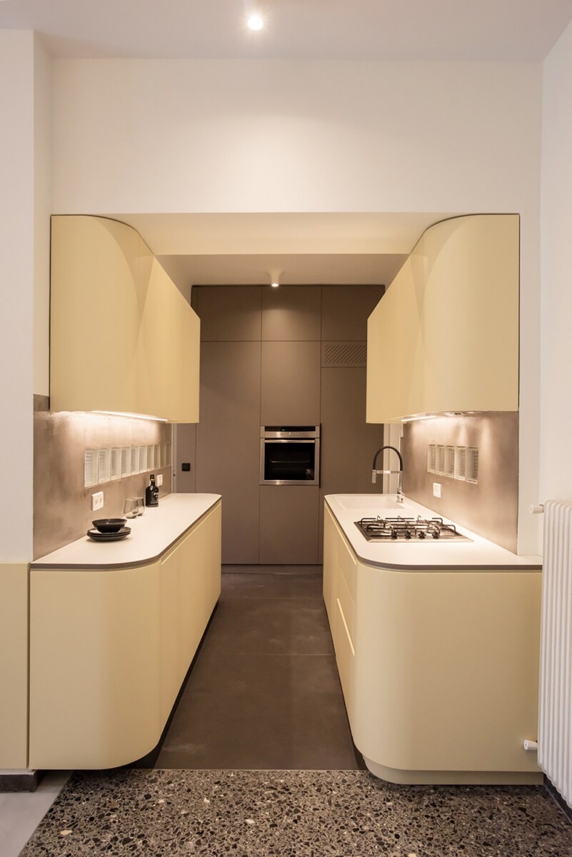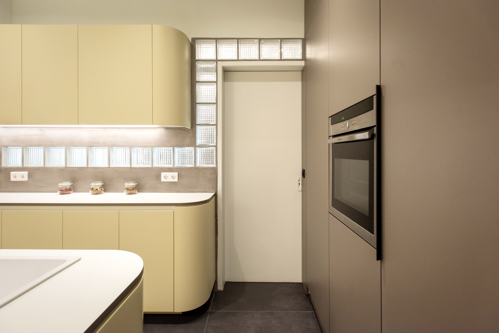 Η προηγουμένως σκοτεινή και «κρυφή» κουζίνα, η οποία έβλεπε στον μικρό φωταγωγό, μεταφέρεται «μπροστά» και επανασχεδιάζεται: ανοίγει προς τον χώρο του καθιστικού και αποκτά φυσικό φως.