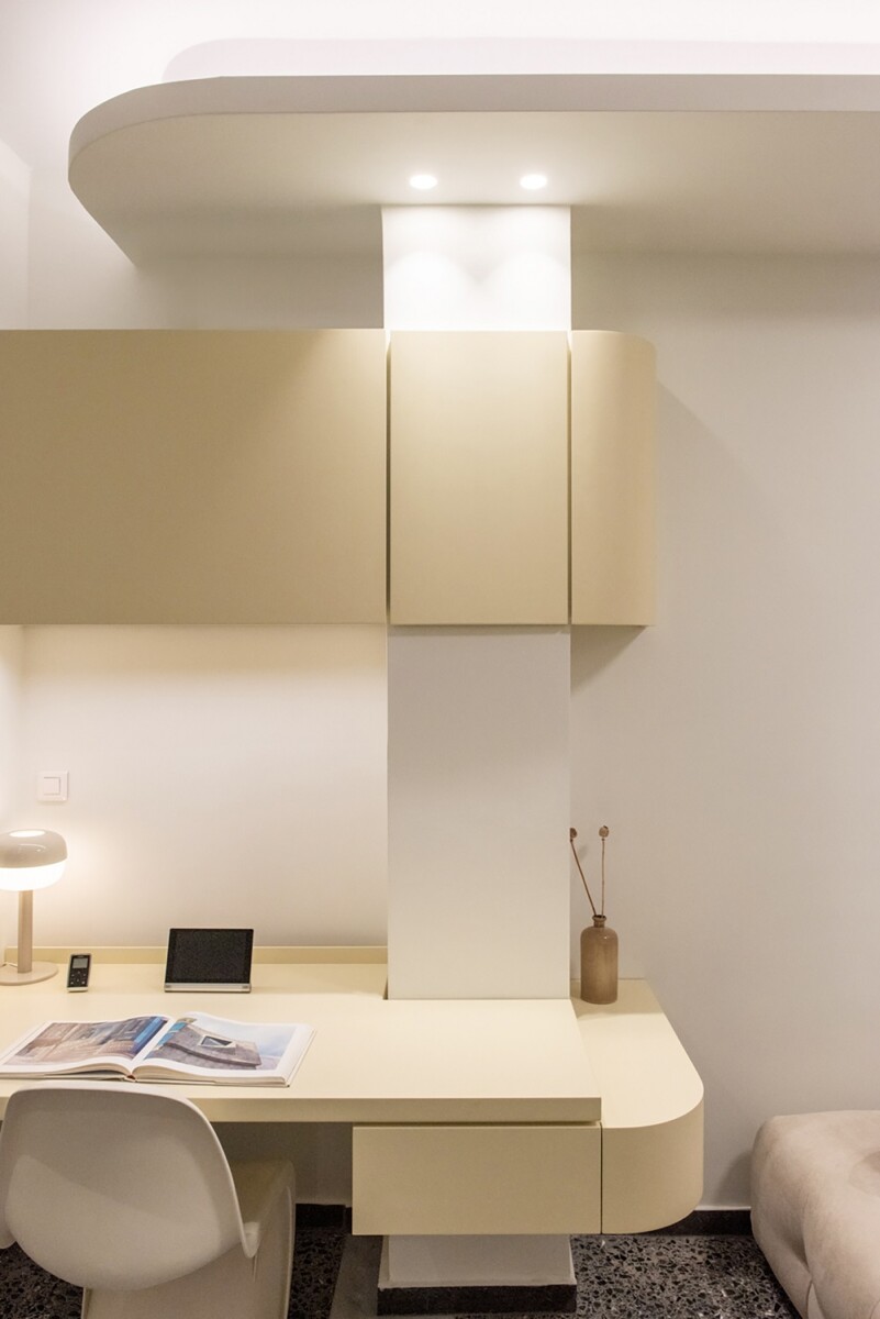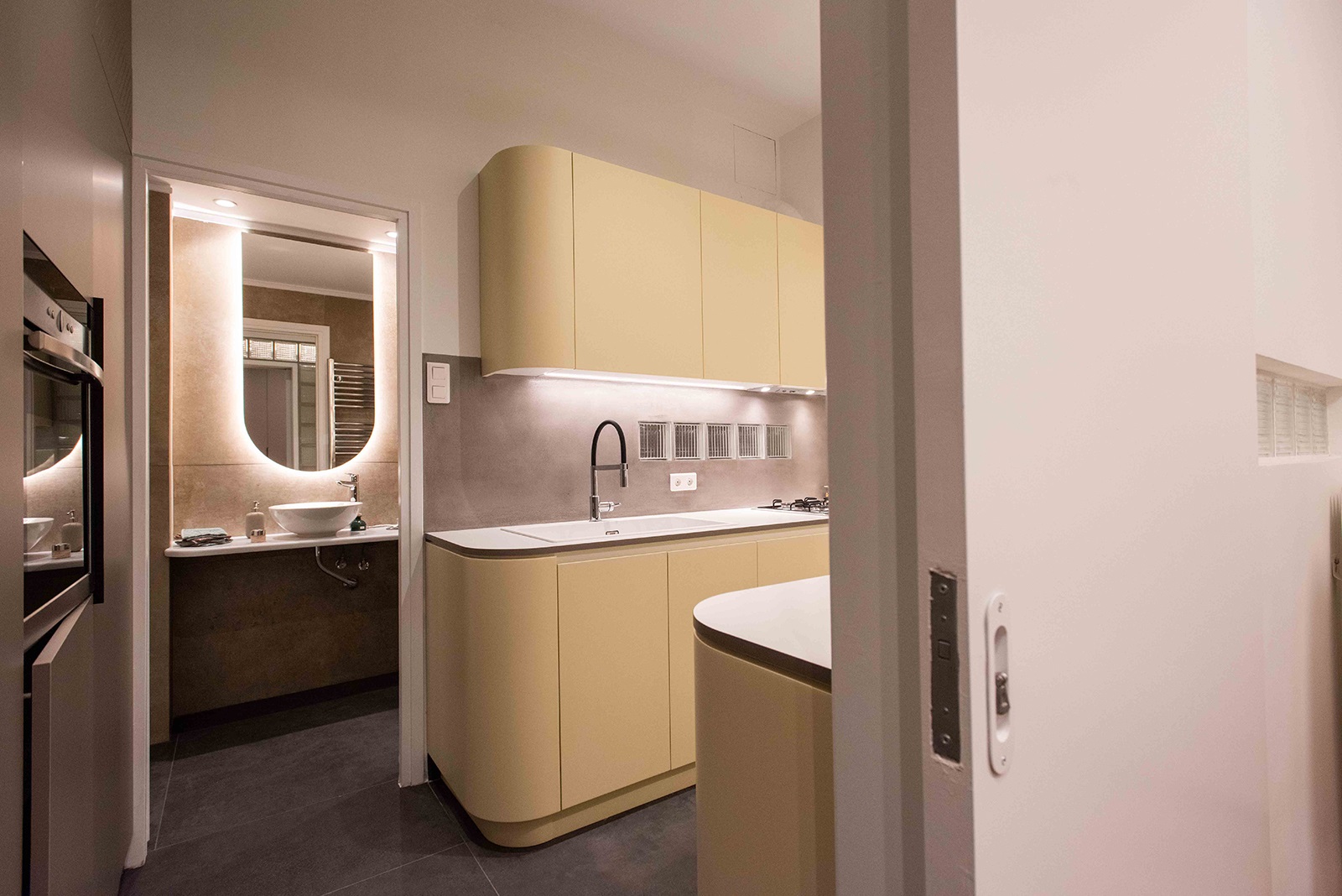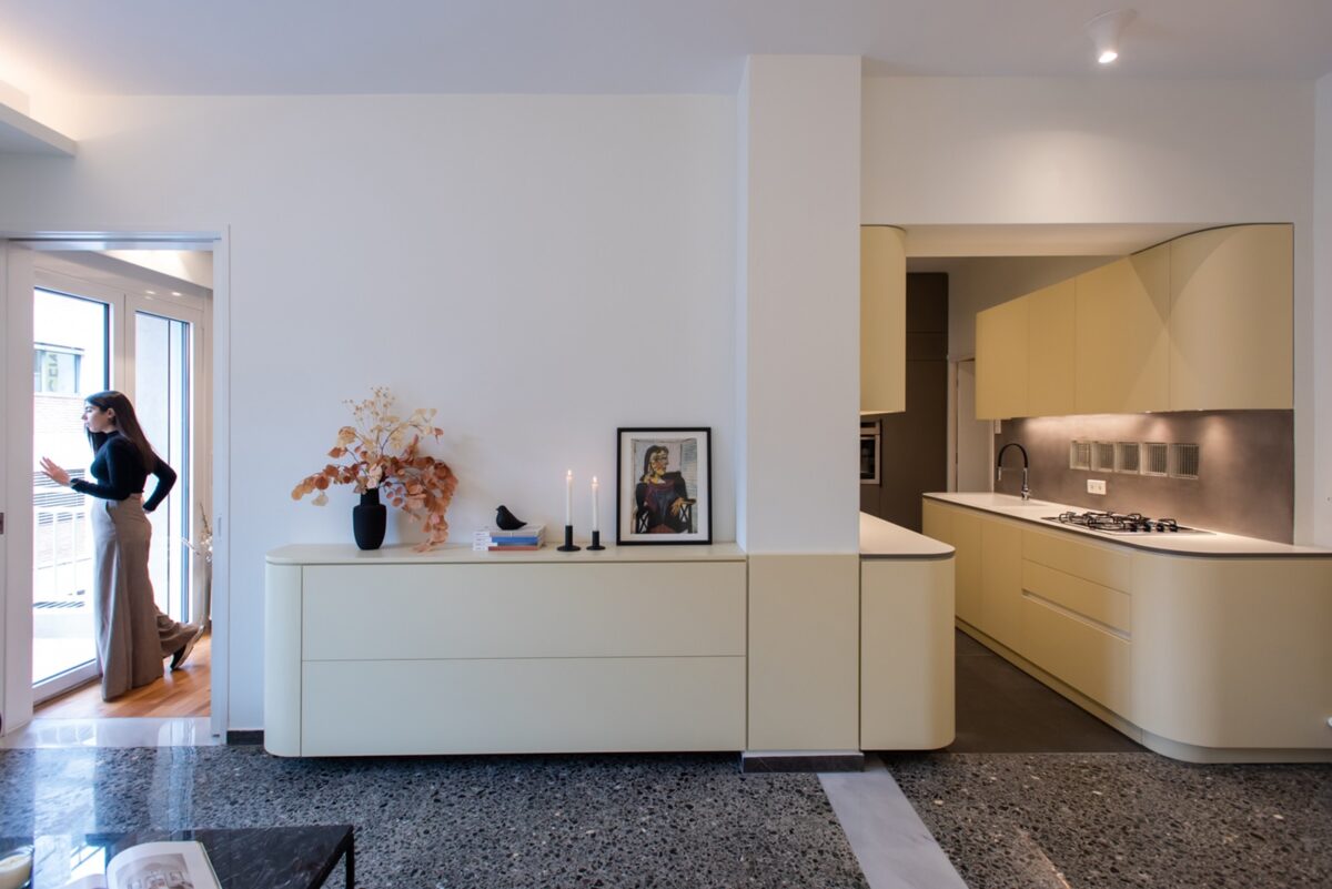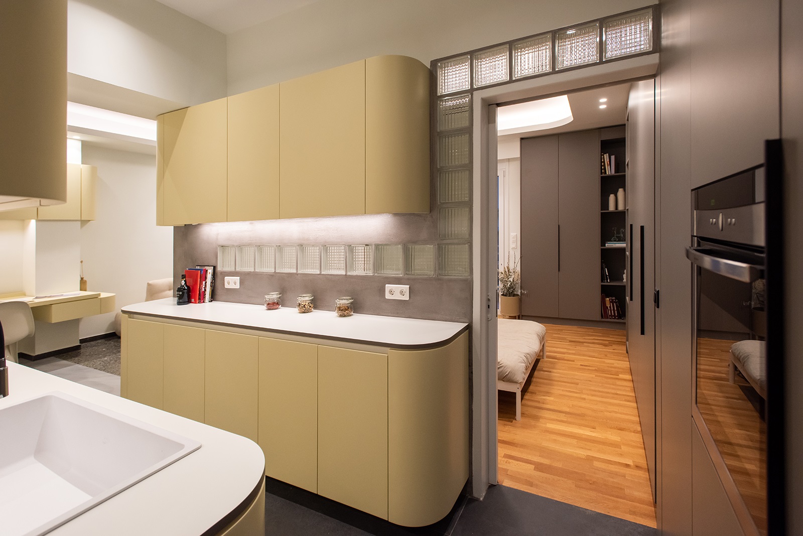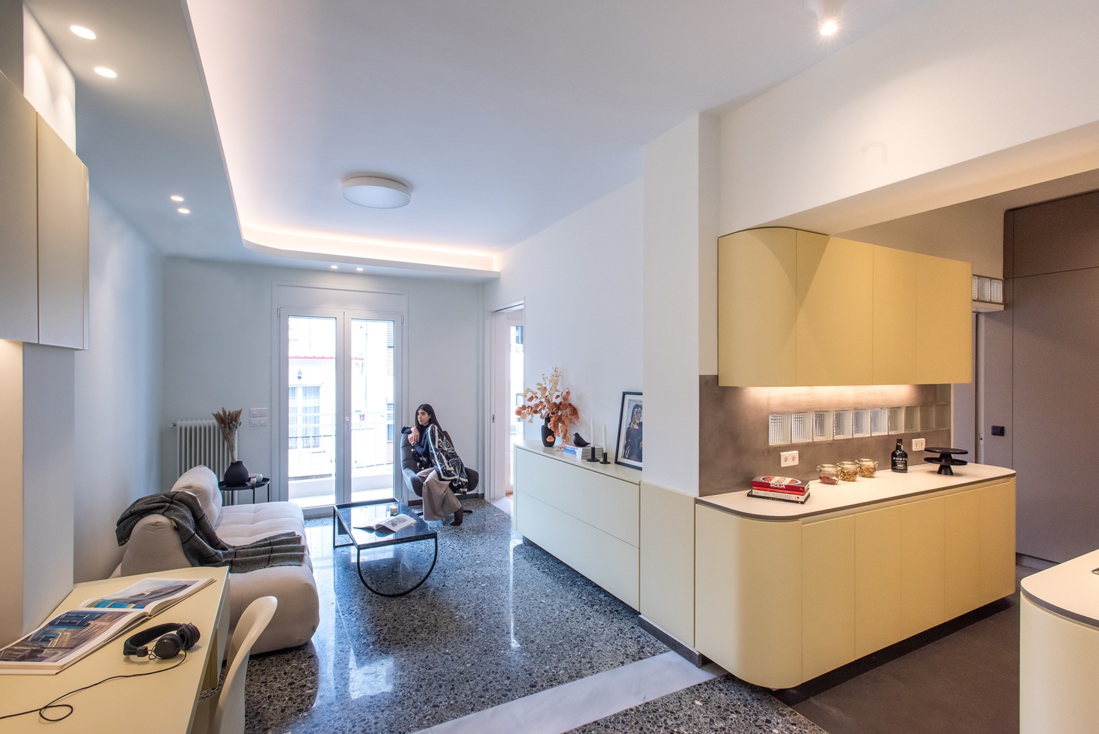 Ο χώρος της κουζίνας ενοποιείται με το καθιστικό και το υπνοδωμάτιο, καθώς τα έπιπλά της συνεχίζουν και στους δύο χώρους. Το κιτρινωπό λακαριστό ξύλο καμπυλώνει στις γωνίες και μετατρέπεται από ερμάριο κουζίνας σε έπιπλο καθιστικού, σηματοδοτώντας τη συνέχεια.
