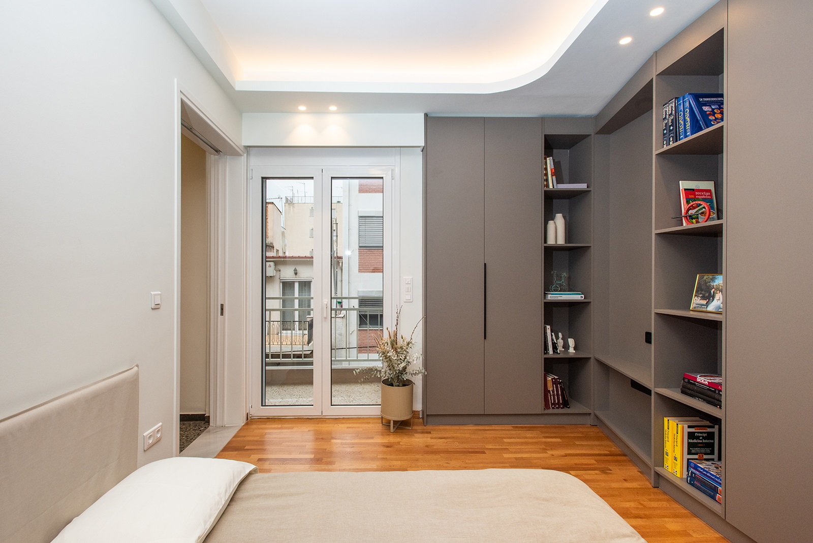 Τα ψηλά ντουλάπια της κουζίνας συνεχίζουν, χωρίς διακοπή, μέσα στο υπνοδωμάτιο και μετατρέπονται σε ντουλάπα και βιβλιοθήκη.