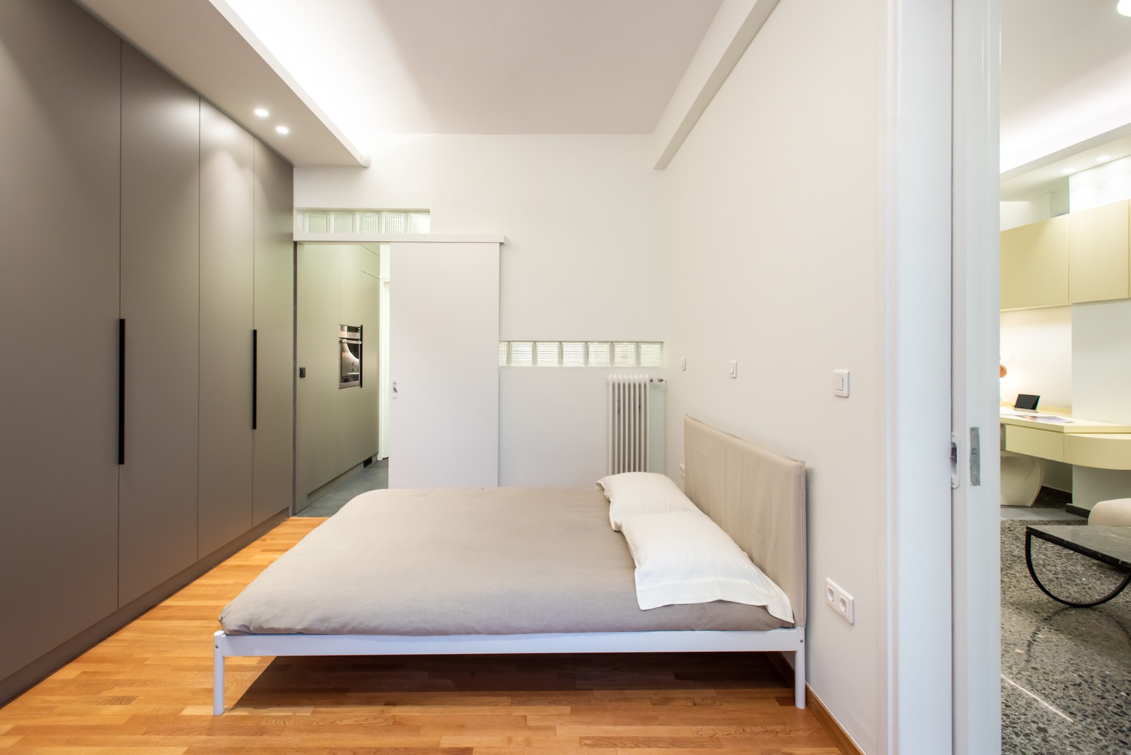 Η ανάγκη για επαρκείς αποθηκευτικούς χώρους μέσα σε ένα τόσο μικρό διαμέρισμα αποτέλεσε καθοριστικό παράγοντα για τον σχεδιασμό της μεγάλης, ενιαίας ντουλάπας στο υπνοδωμάτιο.