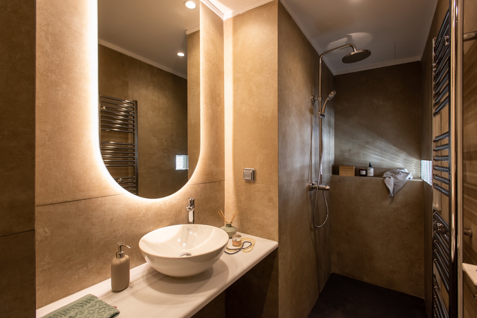 Η ροή της κίνησης μέσα στο διαμέρισμα υπονοείται από την συνέχεια των επίπλων μεταξύ των διαφορετικών χώρων και τον περιμετρικό κρυφό φωτισμό της οροφής, ο οποίος υλοποιείται ως μια γραμμή led στην οροφή που ακολουθεί την κίνηση και διατρέχει όλους τους χώρους.