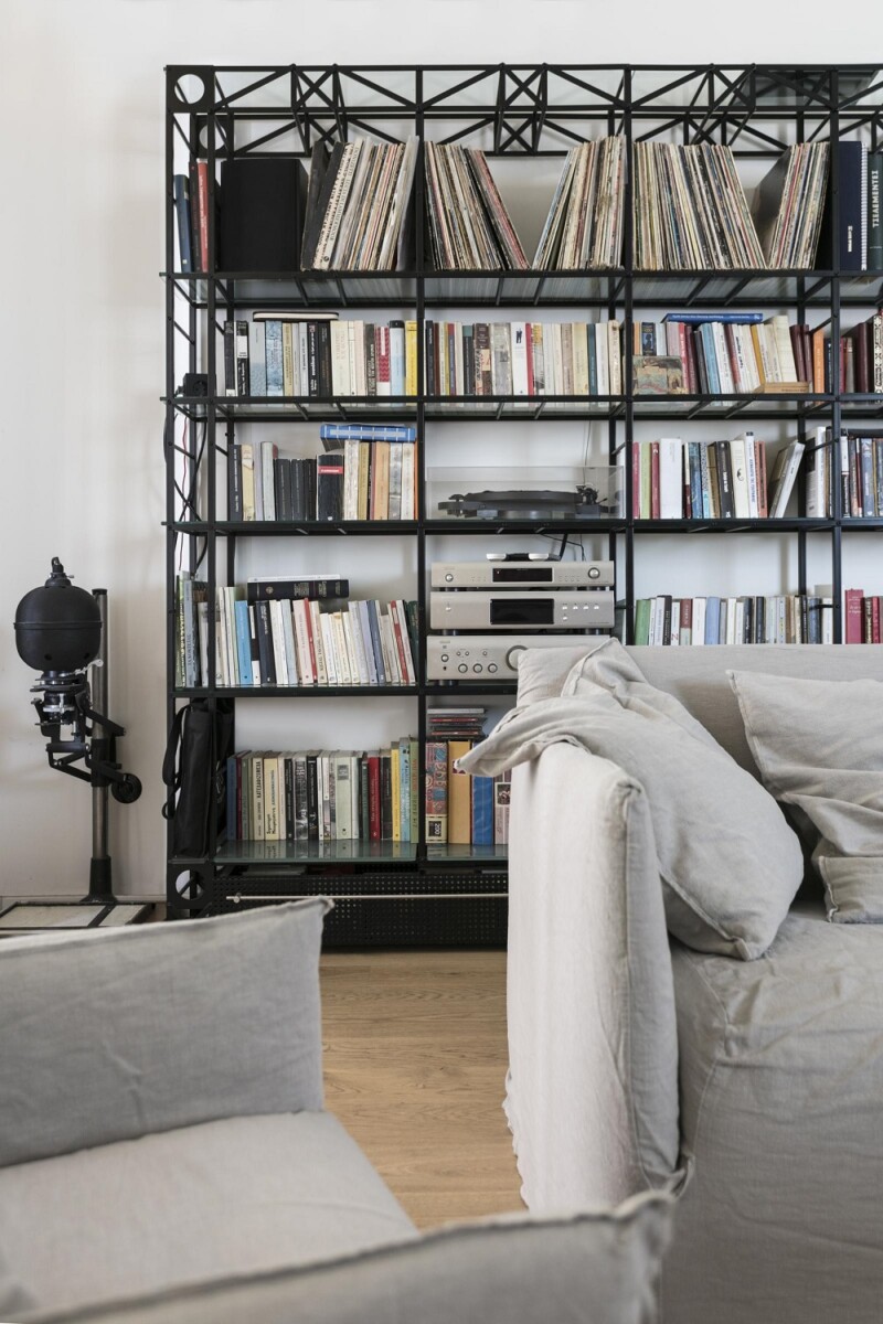 Τα industrial στοιχεία είναι εμφανή στη μεταλλική βιβλιοθήκη, το τραπεζάκι με τον μεταλλικό σκελετό και τις μεταλλικές καρέκλες τύπου Tolix, τα οποία έρχονται σε αντίθεση με τα ζεστά φυσικά υλικά.