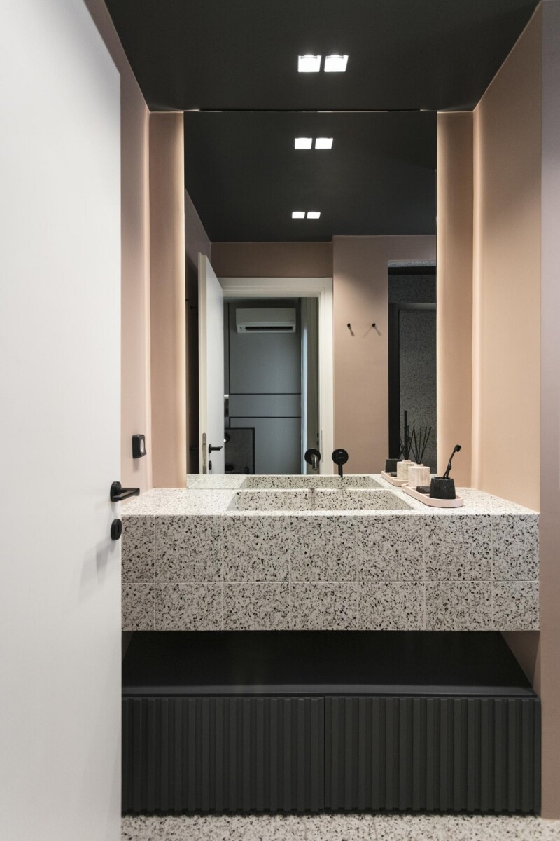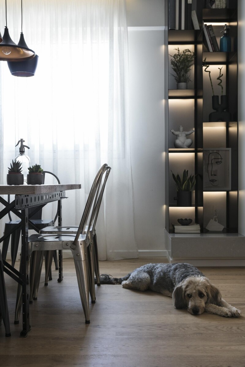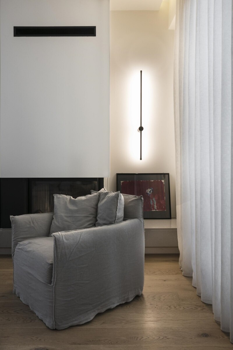Επιπλέον, ο φωτισμός έπαιξε βασικό ρόλο στον σχεδιασμό του διαμερίσματος και όχι συμπληρωματικό. Κάθε χώρος έχει διαφορετικά σενάρια φωτισμού, ώστε να ικανοποιεί τις ανάγκες της οικογένειας και να δημιουργεί την κατάλληλη ατμόσφαιρα. Ο γραμμικός φωτισμός σε κάποια σημεία, σε συνδυασμό με τα κρεμαστά φωτιστικά του Tom Dixon στην τραπεζαρία και τους κρυφούς φωτισμούς, έχει ως στόχο να αναδείξει τις σχεδιαστικές γραμμές και τα υλικά.