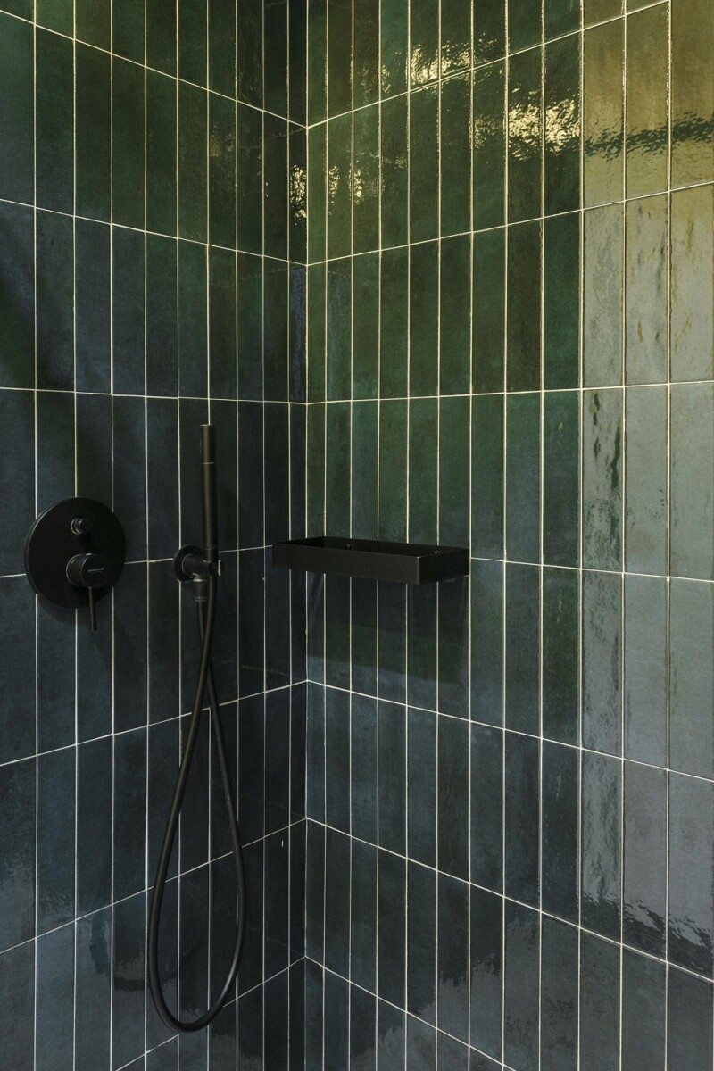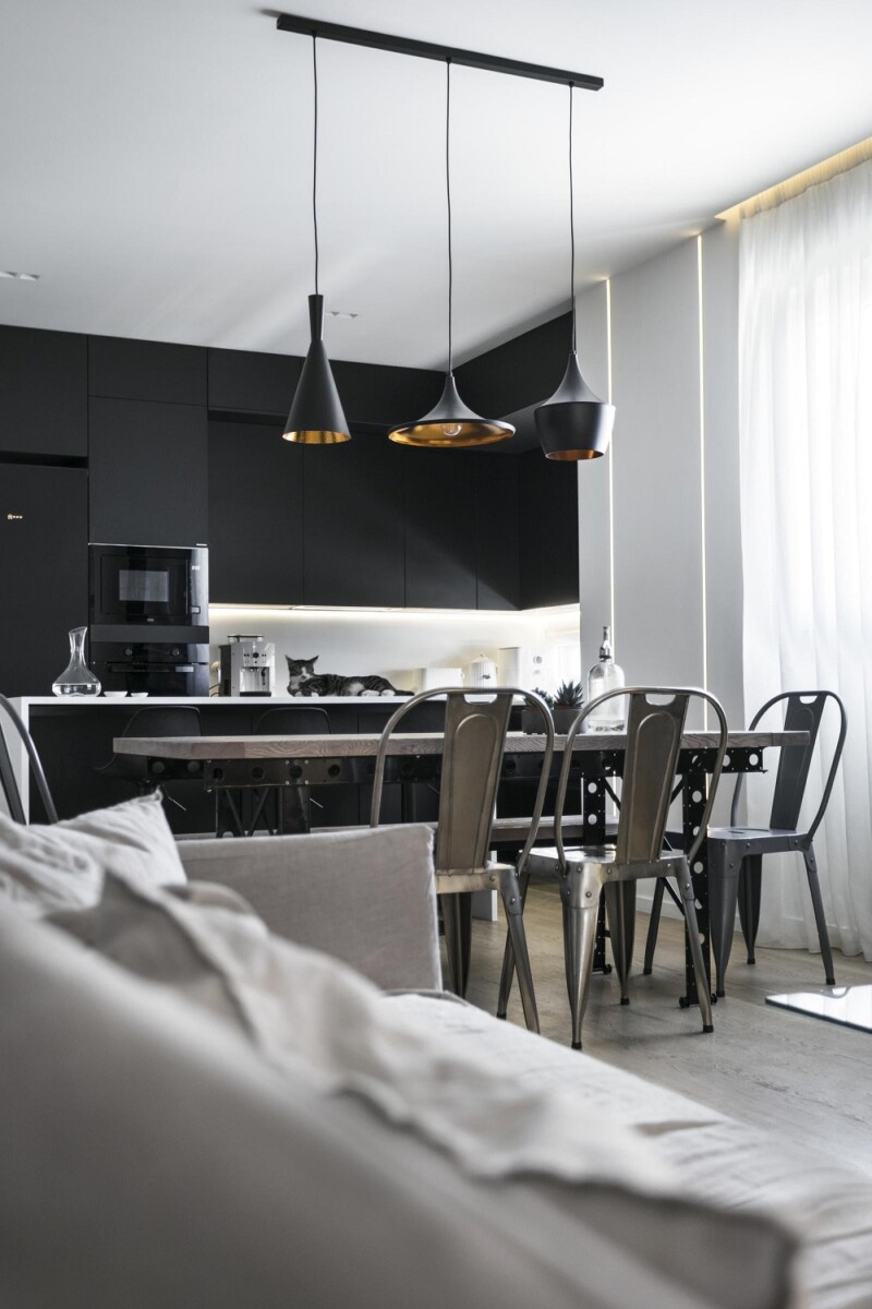 Η κουζίνα διαφοροποιείται με έντονες χρωματικές αντιθέσεις: μαύρα ντουλάπια συνδυάζονται με λευκό Corian ώστε να δημιουργηθεί μια σαφής διάκριση ανάμεσα στη ζώνη μαγειρέματος και την τραπεζαρία. Το υφιστάμενο δοκάρι μετατράπηκε από κατασκευαστικό περιορισμό σε σχεδιαστικό στοιχείο.