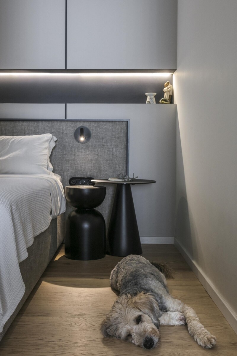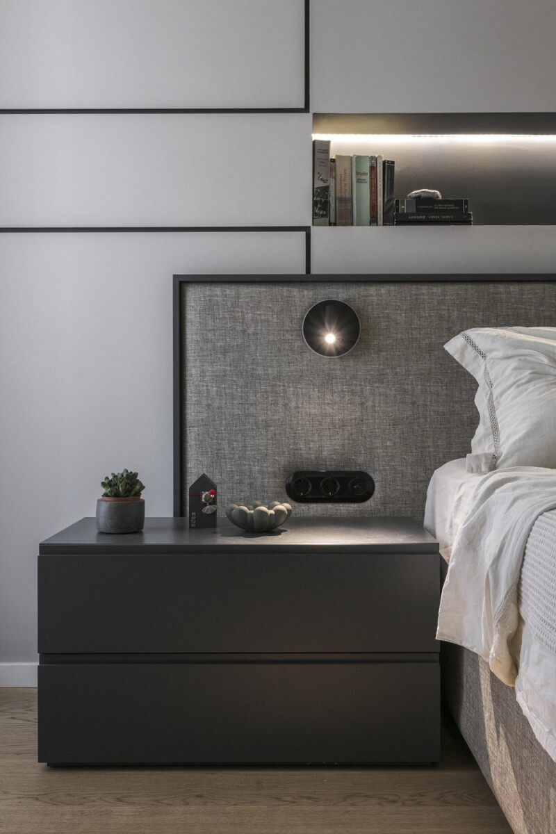 Ο σχεδιασμός των υπνοδωματίων ακολουθεί την ίδια φιλοσοφία με τον κεντρικό χώρο. Το κύριο υπνοδωμάτιο είναι ένας ήρεμος χώρος ξεκούρασης, όπου απαλές γκρι και υπόλευκες αποχρώσεις στους τοίχους συνδυάζονται με σκούρο γκρι στο κρεβάτι. Στο λουτρό του συναντάμε μια σχεδιαστική έκπληξη: μαύρη οροφή, που δημιουργεί έντονη αντίθεση και αίσθηση βάθους.