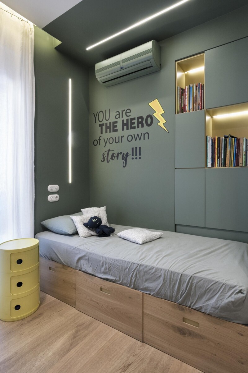 Τα δύο παιδικά υπνοδωμάτια, είναι σχεδιασμένα με γνώμονα την ηλικία και την προσωπικότητα των παιδιών. Το ένα, με έντονα χρώματα σε πράσινους και κίτρινους τόνους, αποπνέει ζωντάνια, ενώ το άλλο, σε ουδέτερες αποχρώσεις, δημιουργεί μια πιο ήρεμη ατμόσφαιρα.