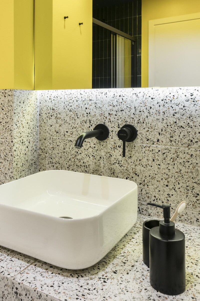 Στο παιδικό λουτρό, το κίτρινο χρώμα κυριαρχεί, ενώ το σκούρο μπλε στην περιοχή της ντουζιέρας προσθέτει μια δυναμική αντίθεση.
