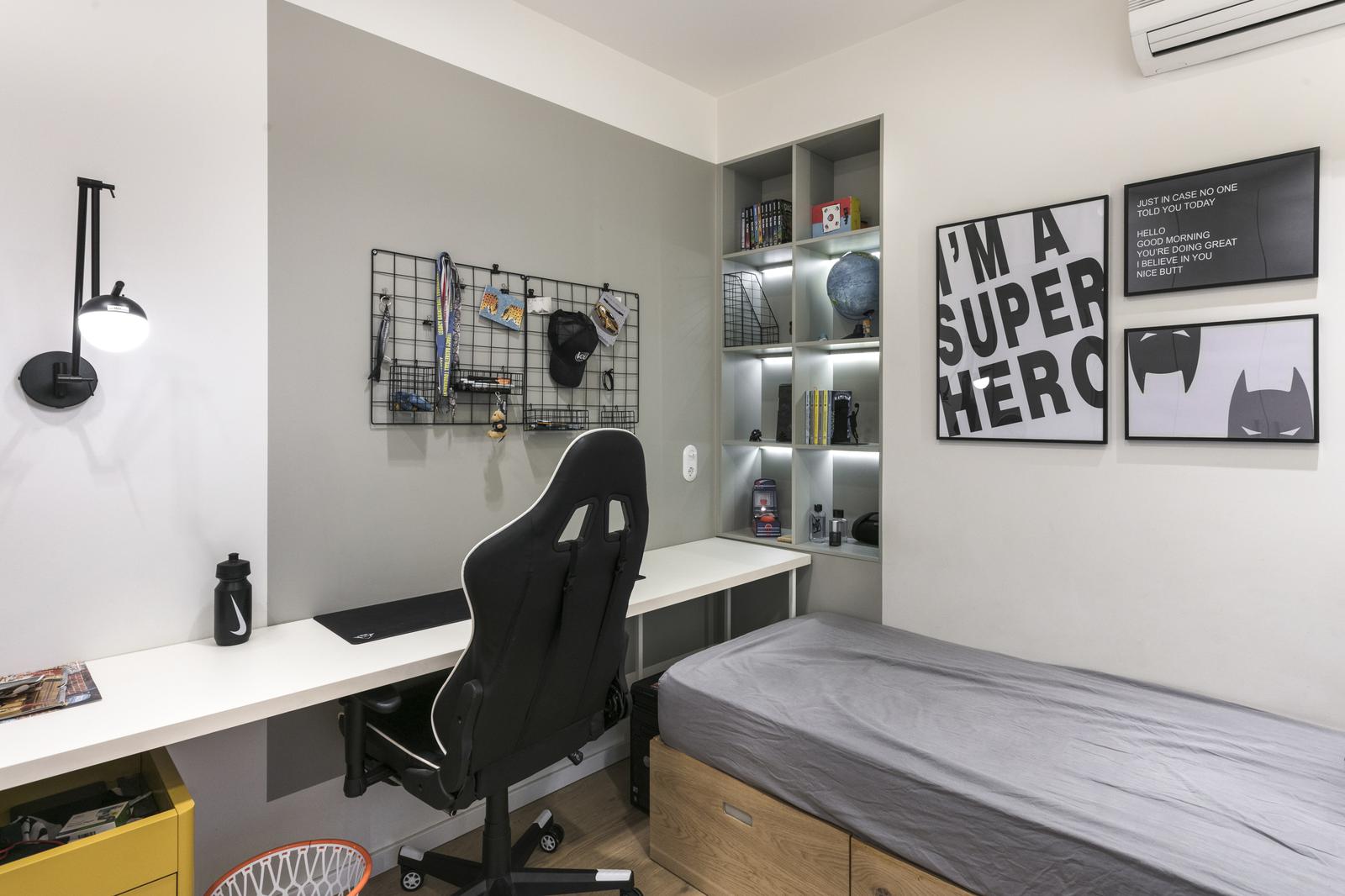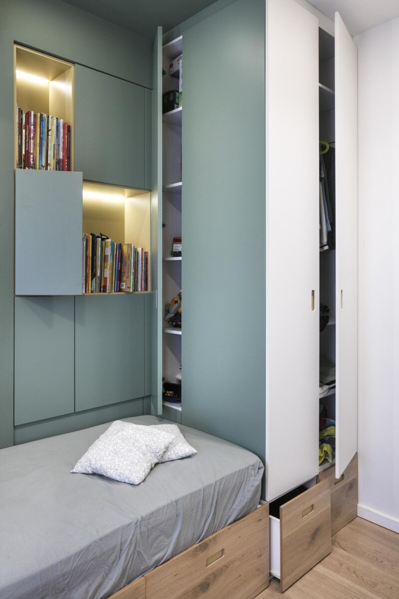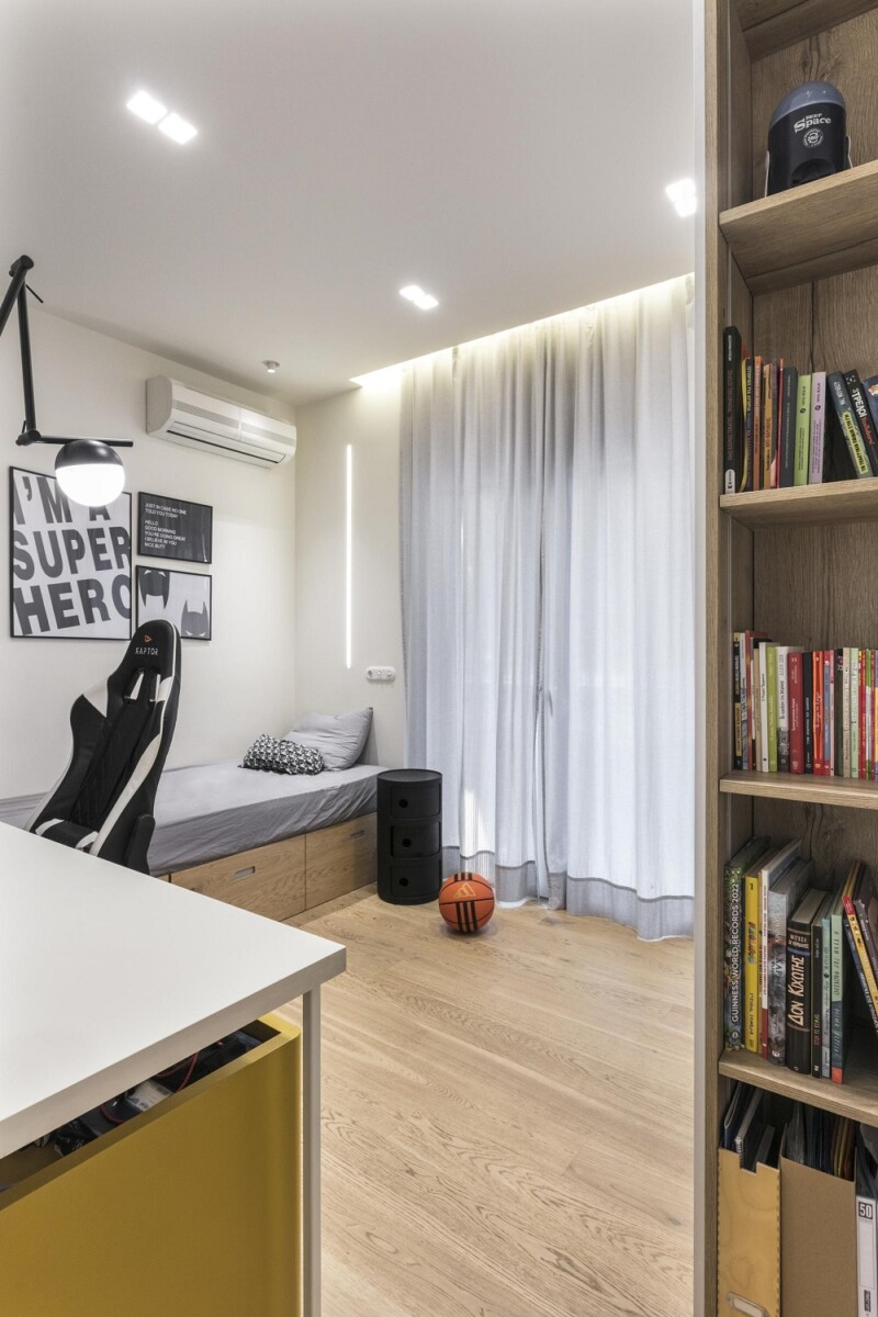 Σημαντικό στοιχείο του σχεδιασμού ήταν η ένταξη της κολώνας και των δοκαριών και στα δυο δωμάτια και η εκμετάλλευση του χώρου ώστε να έχουμε κάθε φορά το μέγιστο των αποθηκευτικών χώρων.