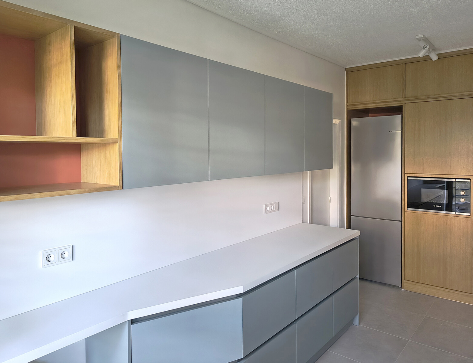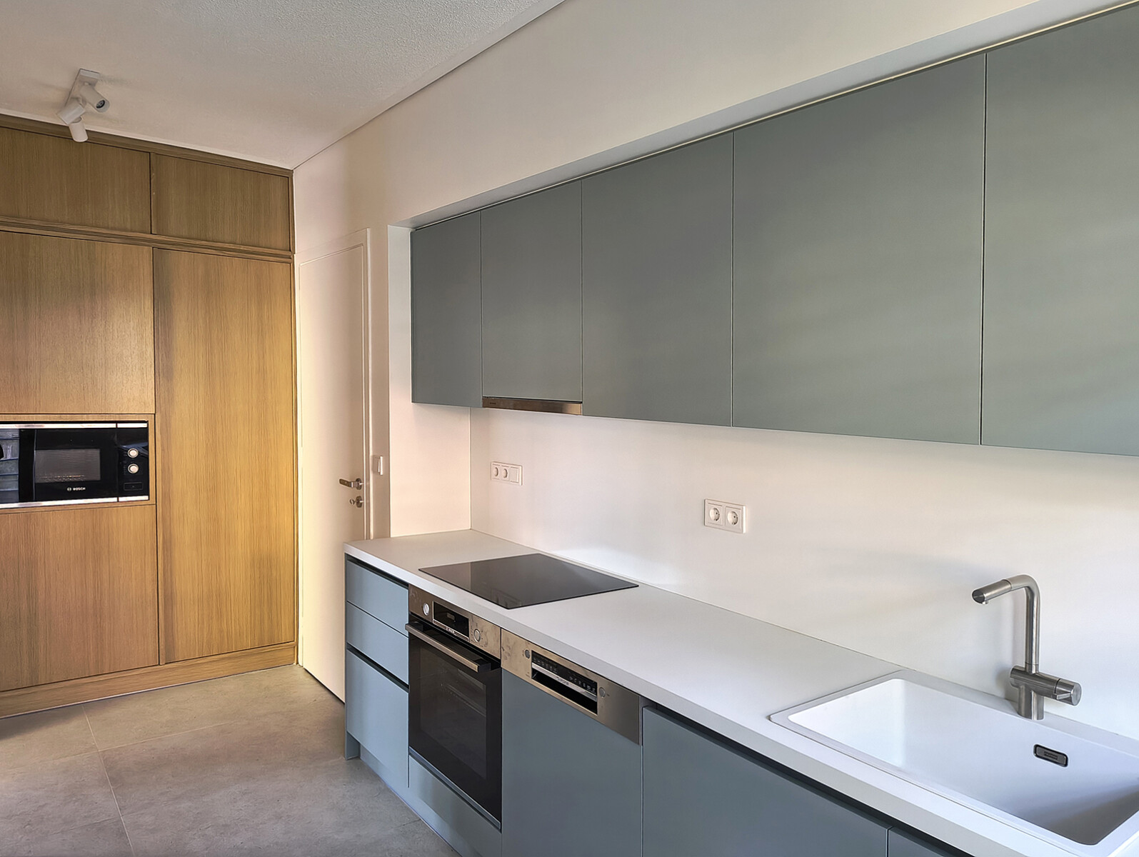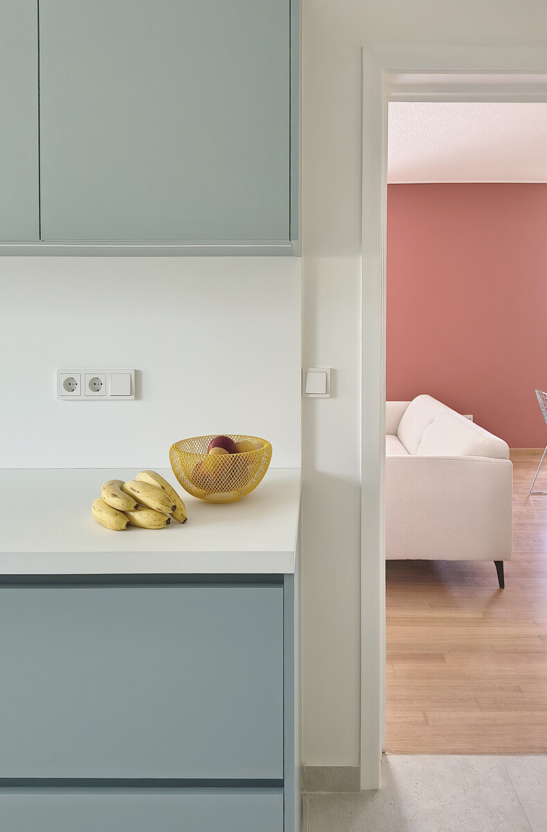 Στην κουζίνα επιχειρείται μια διαρκής εναλλαγή μεταξύ των ξύλινων στοιχείων και των θερμών και ψυχρών τόνων.