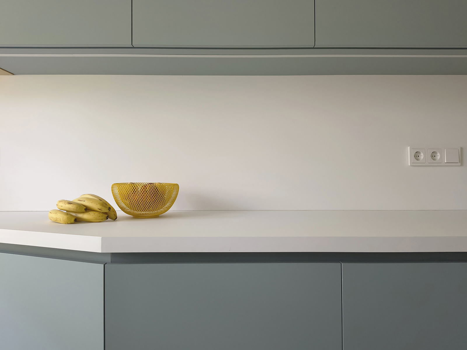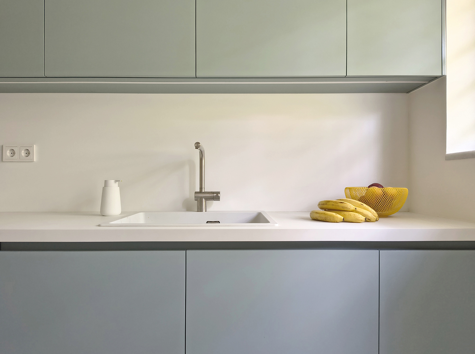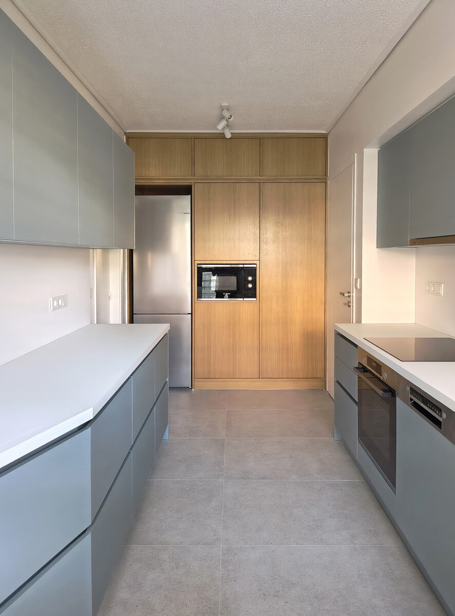 Στην κουζίνα επιχειρείται μια διαρκής εναλλαγή μεταξύ των ξύλινων στοιχείων και των θερμών και ψυχρών τόνων.