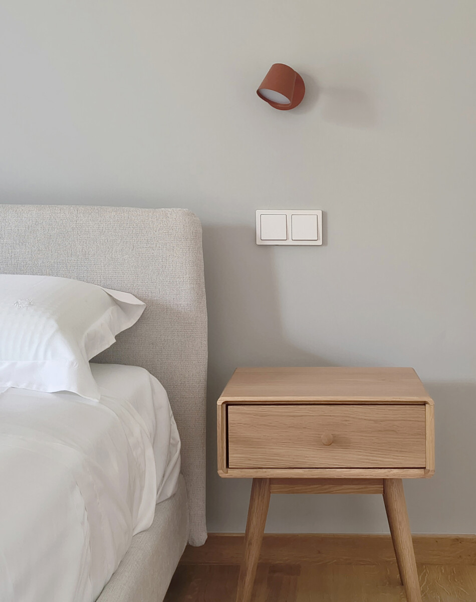 Στους χώρους των υπνοδωματίων ακολουθήθηκε επίσης μια ήπια προσέγγιση υλικών και χρωμάτων, η οποία αναδεικνύει το φυσικό τοπίο.