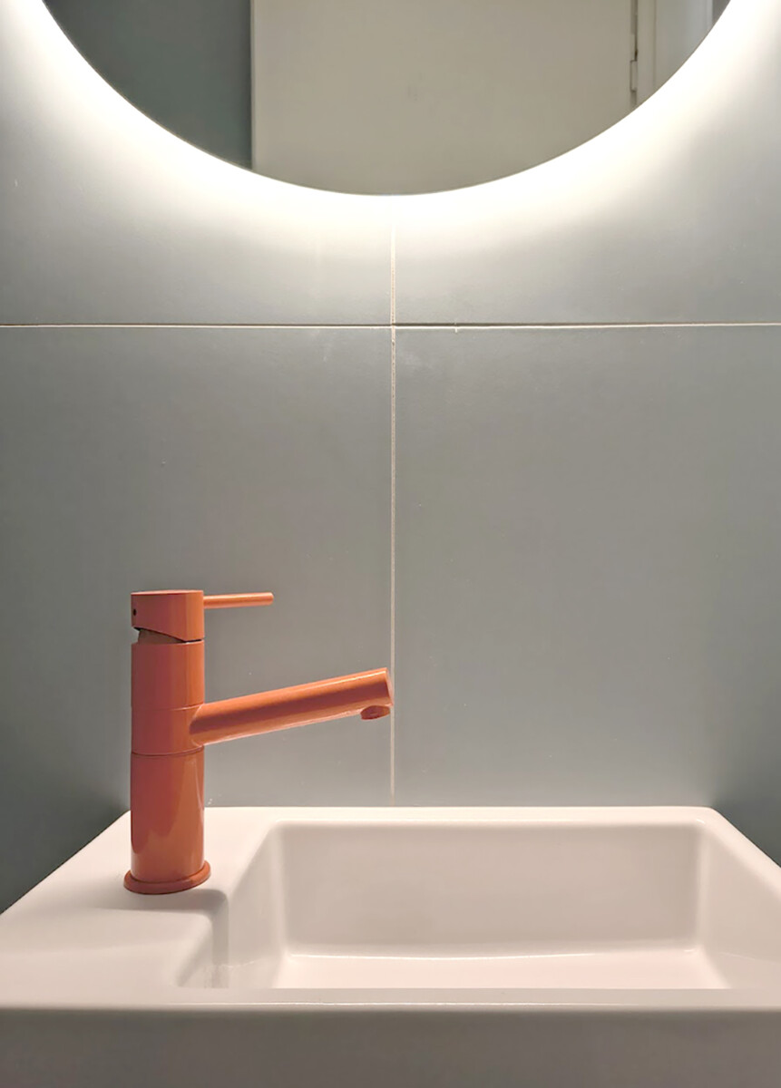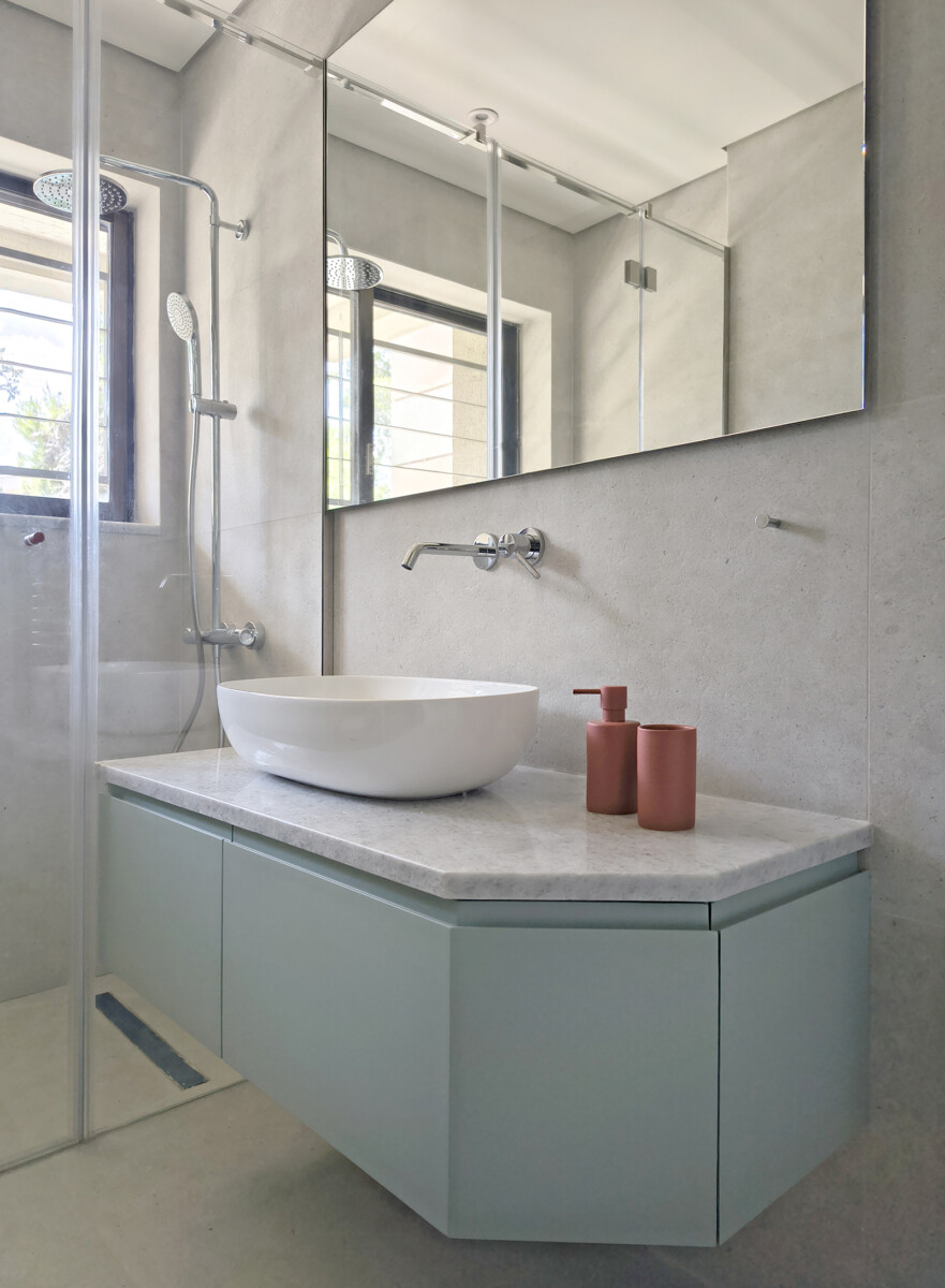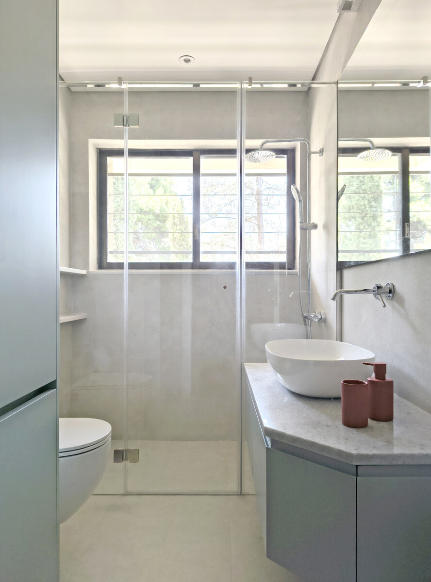 Στο κύριο λουτρό δίνεται πρωταγωνιστικός ρόλος στη θέα προς το τοπίο, ενώ επιχειρείται ένας διάλογος φυσικών υλικών, όπως το γκρι μάρμαρο Νάξου, με στοιχεία που αποτελούν αναφορά στο μοντέρνο κίνημα, όπως τα πλακίδια υφής τσιμέντου.