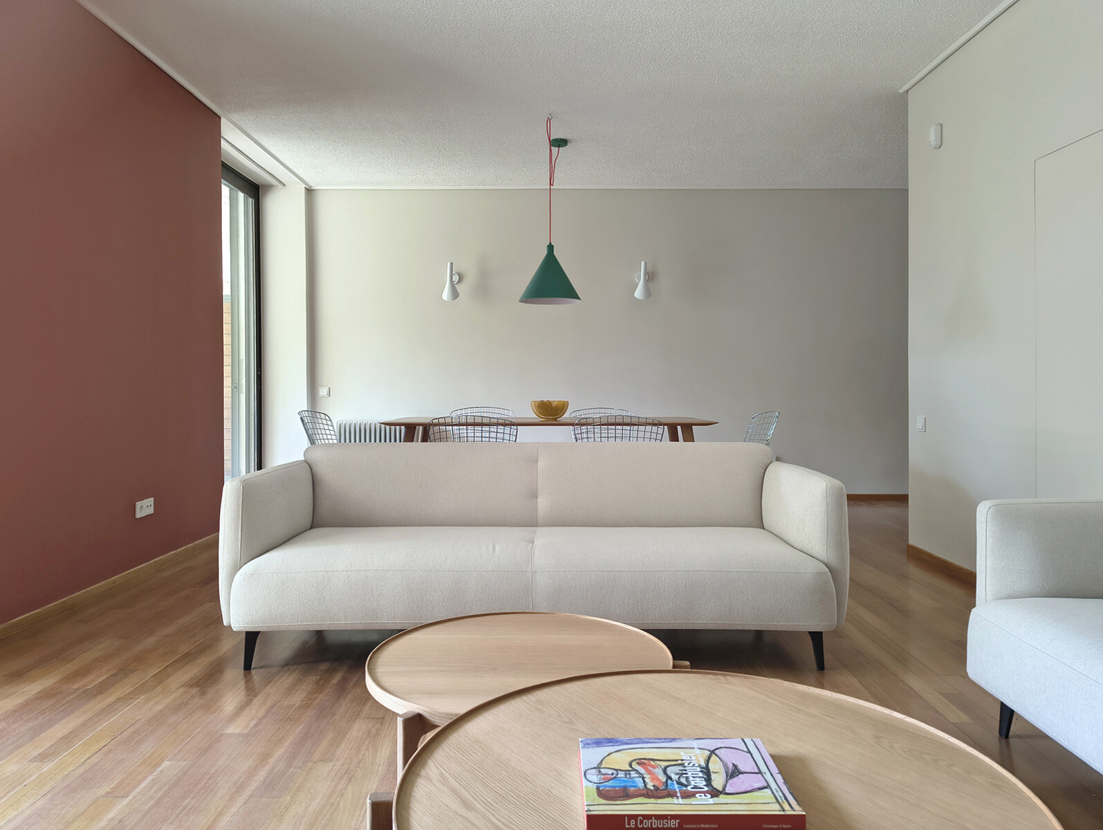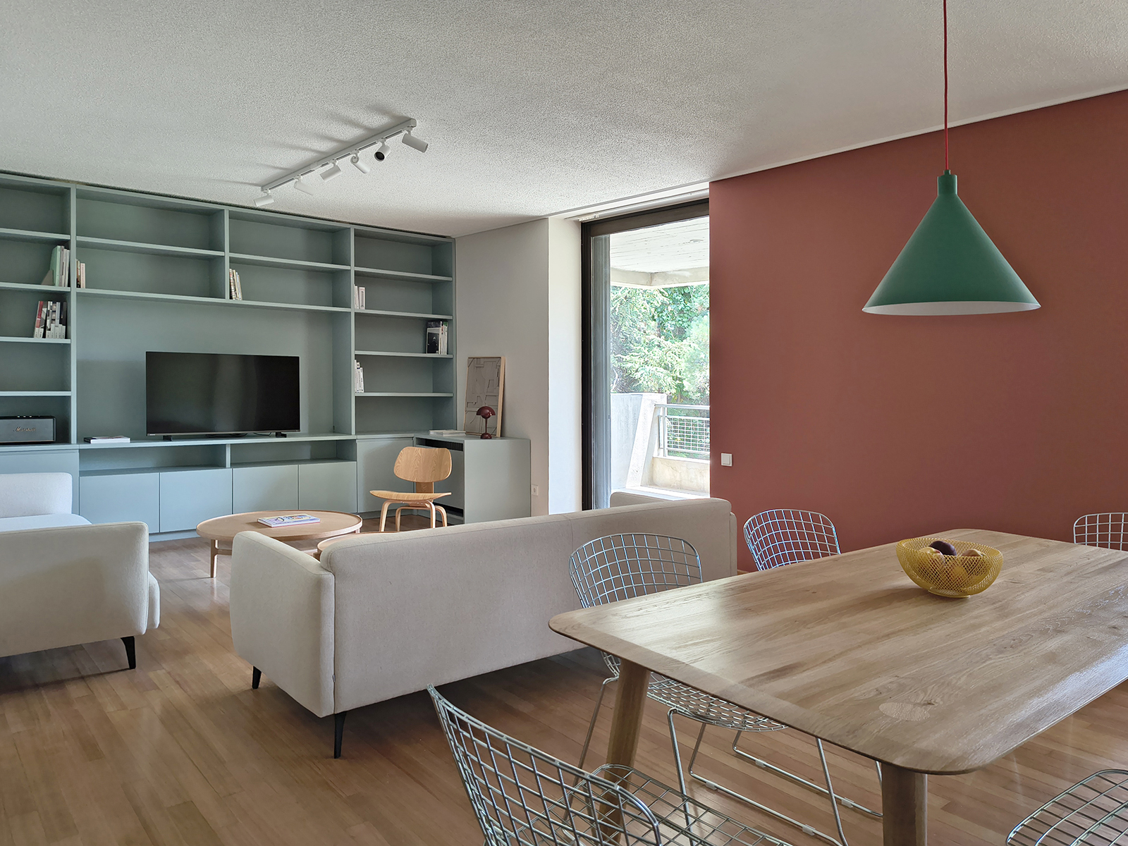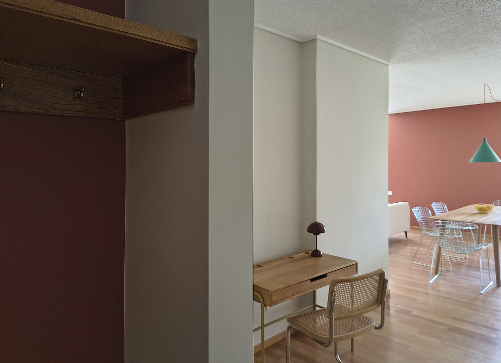 Τυπικό διαμέρισμα στην Κηφισιά, σε μια πολυκατοικία του 1980 που ανήκει τυπολογικά στη συνέχεια του μοντέρνου κινήματος: ανοιχτή κάτοψη, μεγάλα ανοίγματα με απρόσκοπτη θέα προς το περιβάλλων φυσικό τοπίο και κυρίαρχα δρύινα στοιχεία της εποχής, όπως το δάπεδο και οι πόρτες.