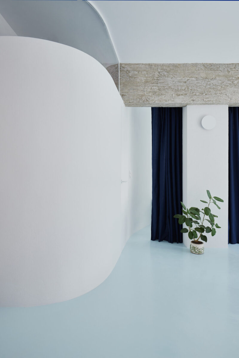 Με εργαλεία έναν καμπύλο λευκό τοίχο, σαν αγκαλιά, μια μπλε κουρτίνα ως κινητό όριο, μια γραμμική κόκκινη κουζίνα στον ρόλο του πυκνωτή και ένα χυτό γαλάζιο πάτωμα στη θέση του σκηνικού καμβά, η αρχιτέκτονας Federica Scalise μετέτρεψε έναν πρώην γραφειακό χώρο στου Γκύζη σ’ ένα φωτεινό ρετιρέ, 42 τ.μ. που υπόσχεται μια ανοιχτή και ευφάνταστη εμπειρία κατοίκησης – ικανή να φιλοξενήσει τις διαρκώς μεταβαλλόμενες ανάγκες της σύγχρονης ζωής.