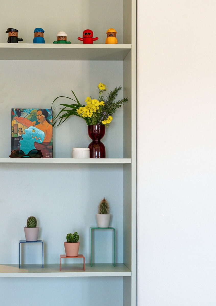 Τα έπιπλα έχουν έντονες αποχρώσεις τερακότας, μπλε, κίτρινου και μέντας, οι οποίες ισορροπούν με τις λευκές επιφάνειες.