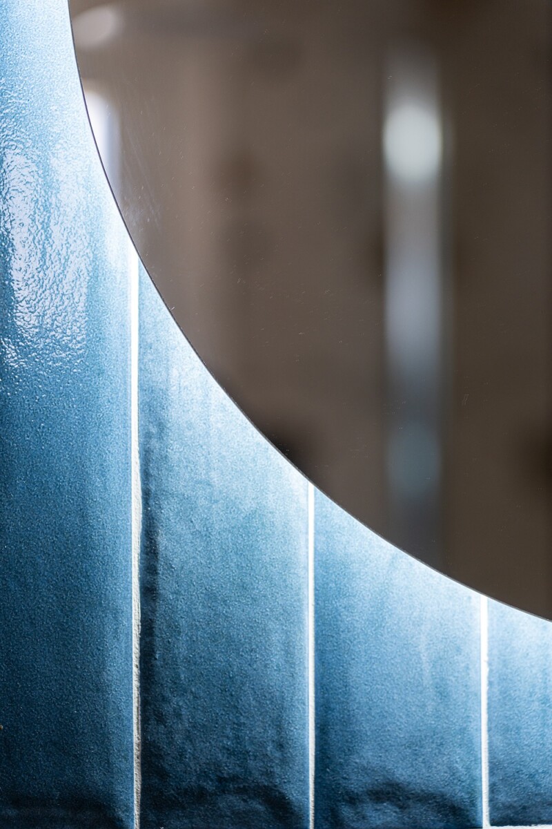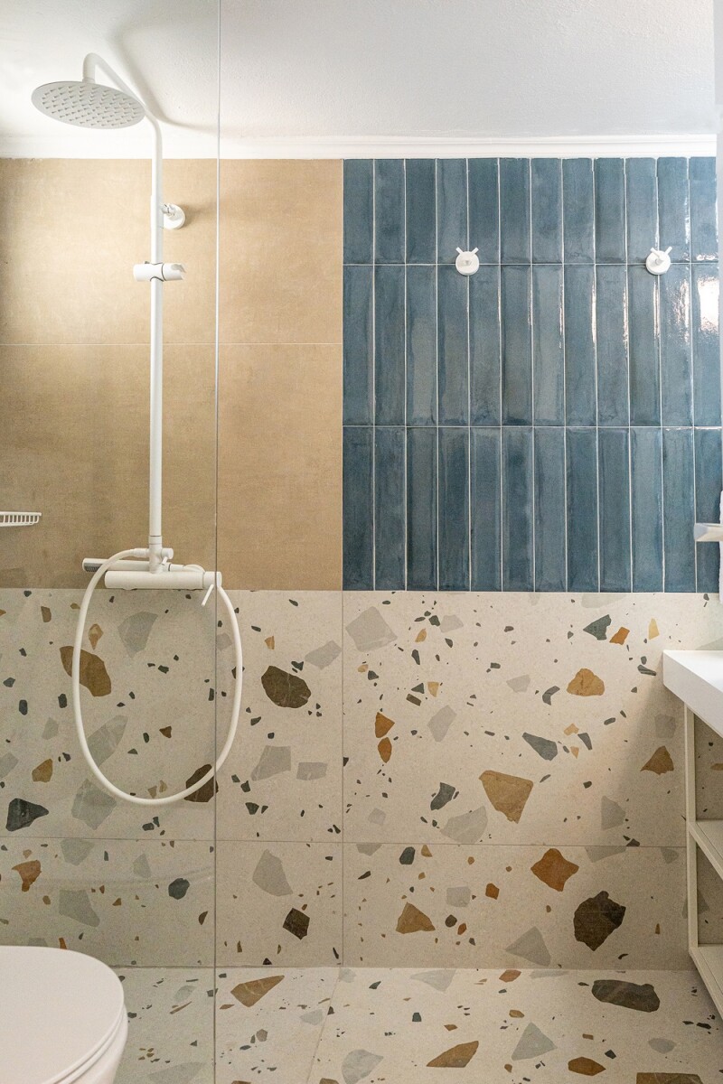 Το μπάνιο ακολουθεί τη λογική του υπόλοιπου διαμερίσματος, με το μπλε της θάλασσας και το χρωματιστό μωσαϊκό στα πλακάκια που θυμίζουν παραλία.
