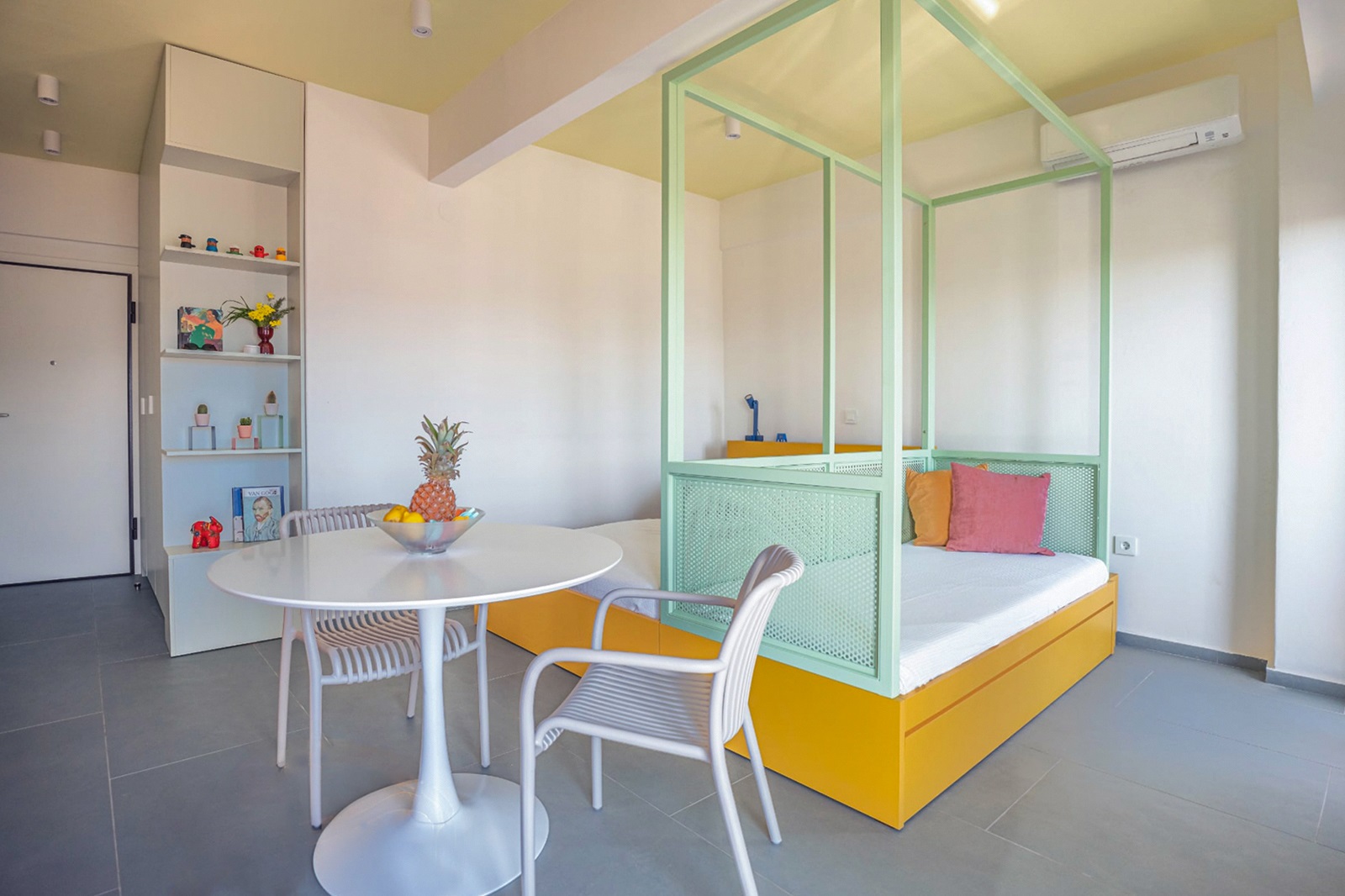 Ο σχεδιασμός του διαμερίσματος ανταποκρίνεται στις προκλήσεις ενός περιορισμένου χώρου, με στόχο τη φιλοξενία έως και μίας τετραμελούς οικογένειας.