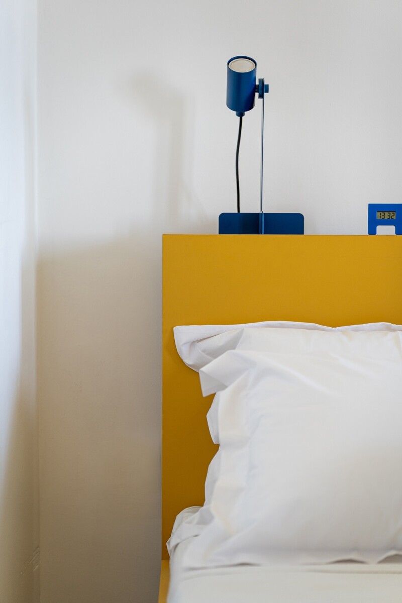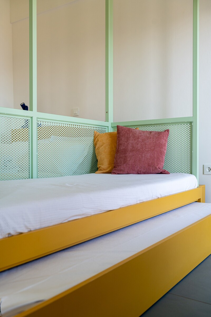 Ταυτόχρονα, η κατασκευή αυτή αποτελεί διαχωριστικό στοιχείο ανάμεσα στο διπλό και το μονό κρεβάτι, προσφέροντας ιδιωτικότητα.