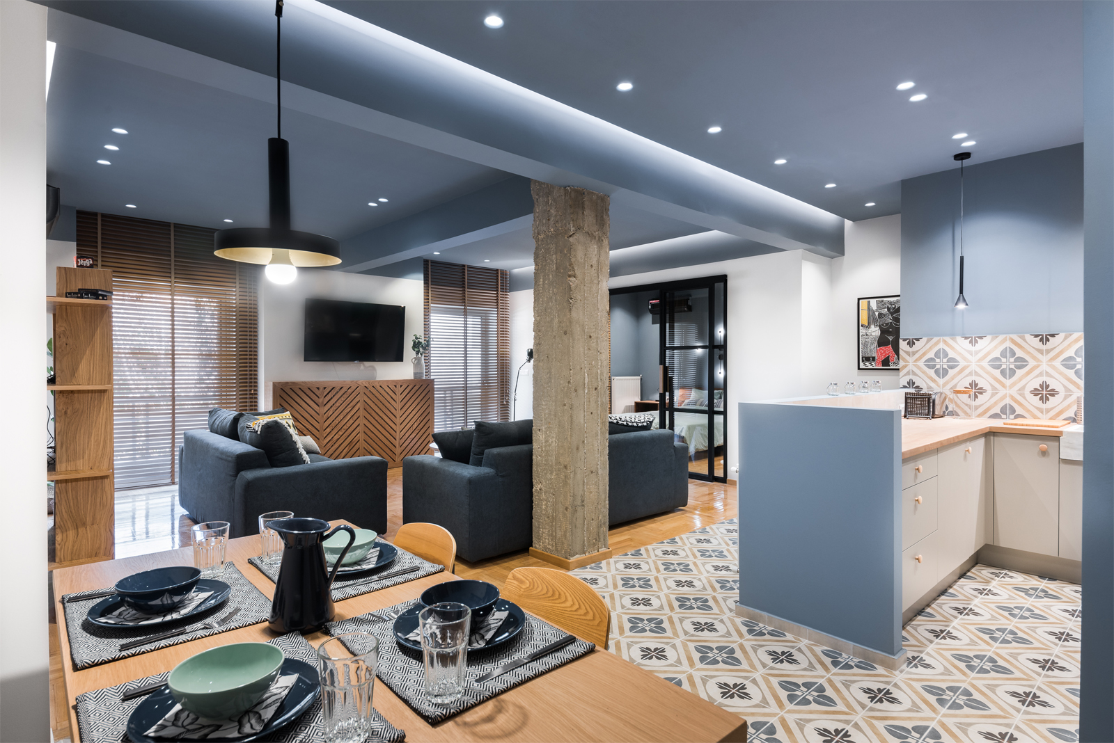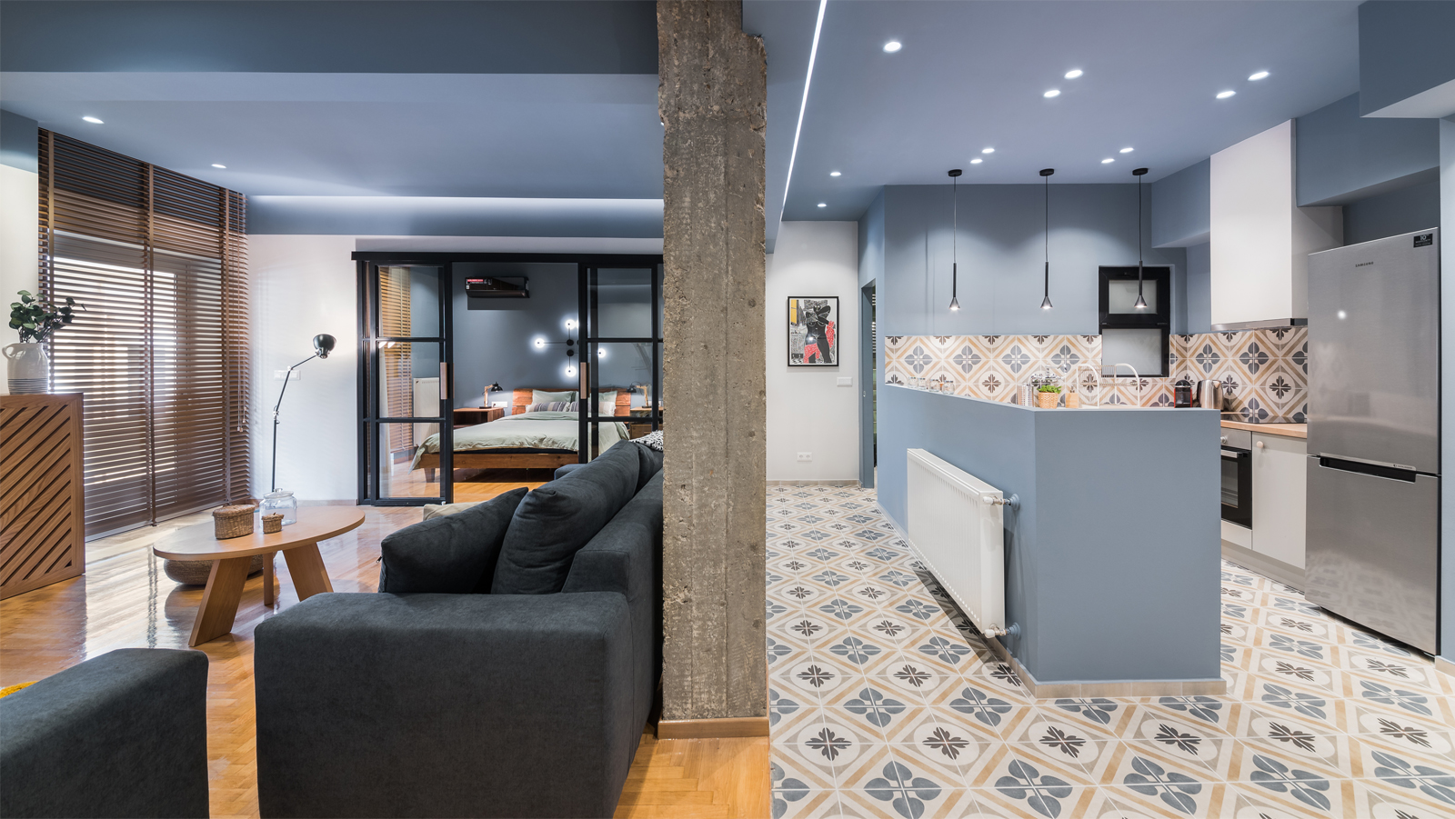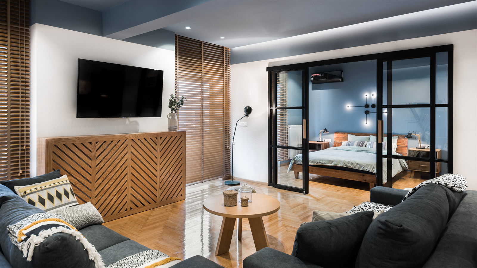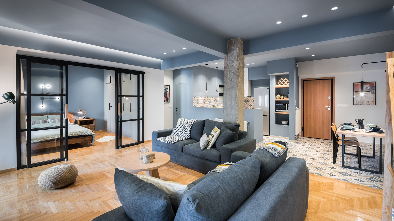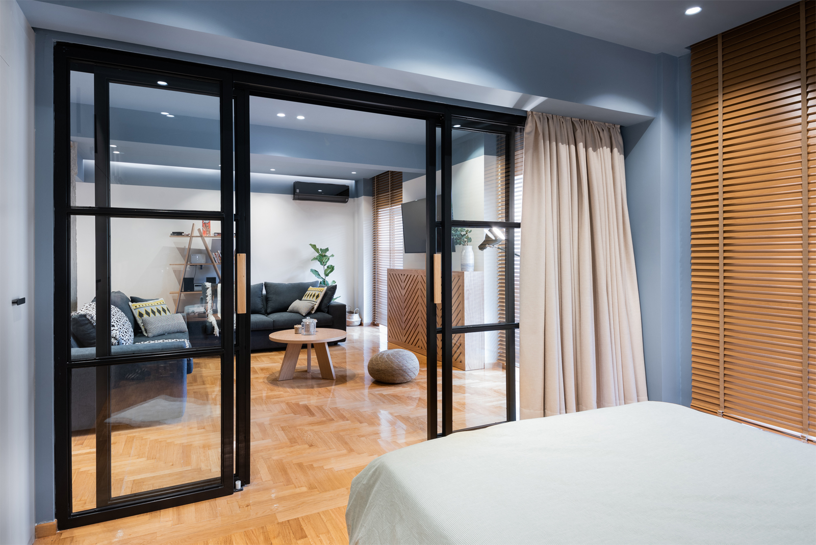 Οι μεταλλικές συρόμενες πόρτες με υαλοστάσια αποτελούν κεντρικό στοιχείο του διαμερίσματος και διαχωρίζουν το υπνοδωμάτιο από το καθιστικό, καθιστώντας τον χώρο εννιαίο όταν τα φύλλα μένουν ανοικτά.