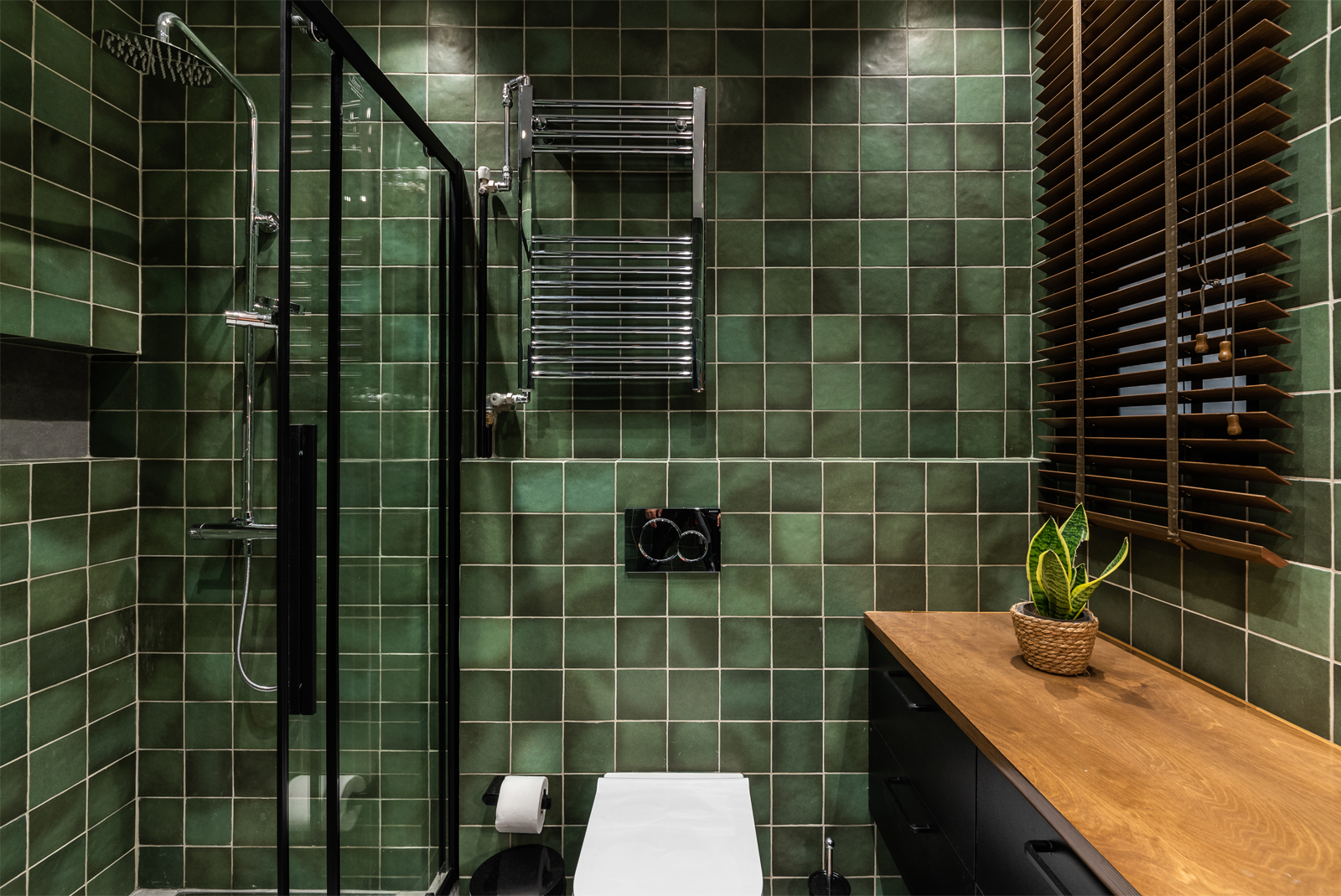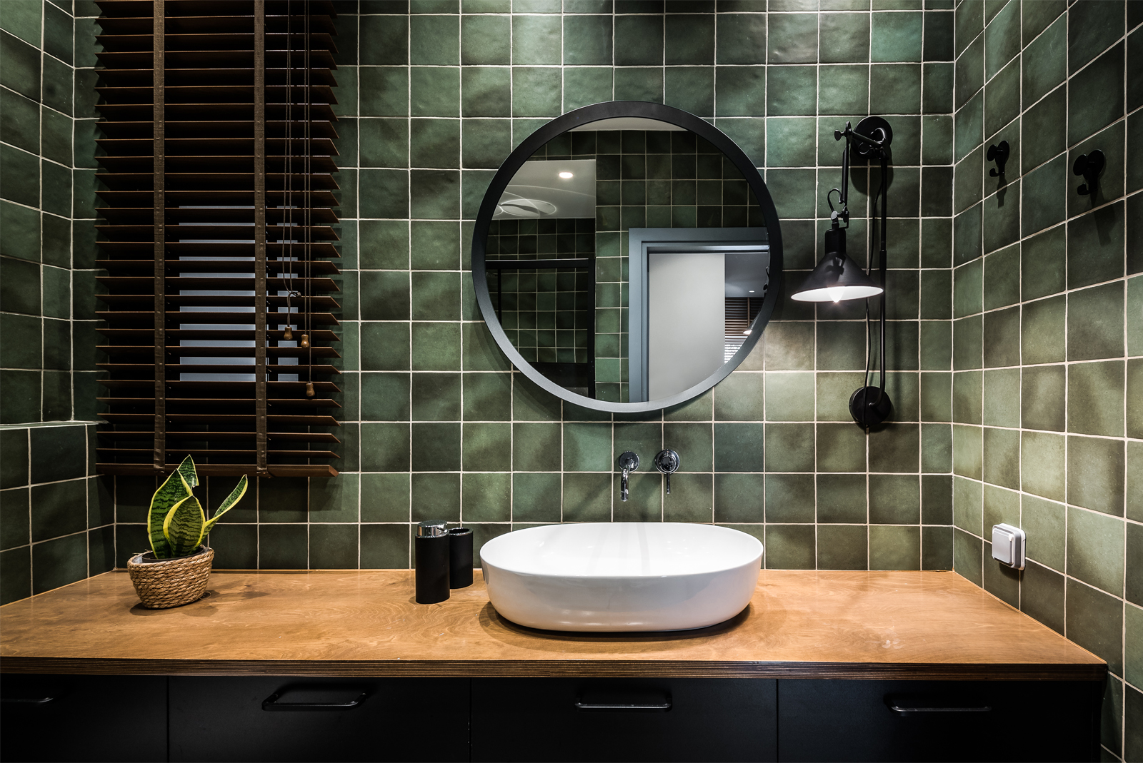 Για το λουτρό, επιλέγεται το πράσινο χρώμα. Για τα έπιπλα και τα στόρια των κουφωμάτων επιλέγονται φυσικά υλικά και απλές γραμμές.
