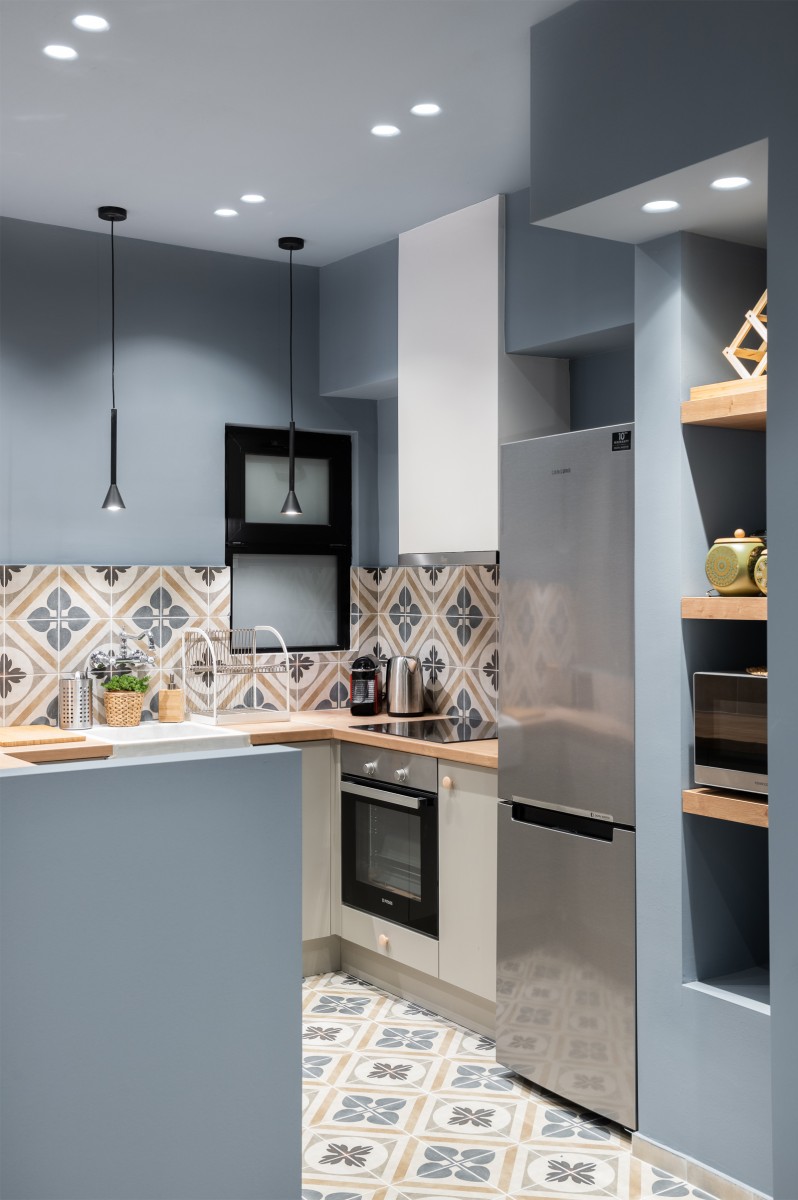 Στην κουζίνα, ο μαρμάρινος νεροχύτης επαναχρησιμοποιείται και συνδυάζεται με γκρι και ξύλινα στοιχεία. Στους τοίχους προτείνεται μια διχρωμία, ως αφαιρετική αναφορά στην αισθητική της δεκαετίας του 70.
