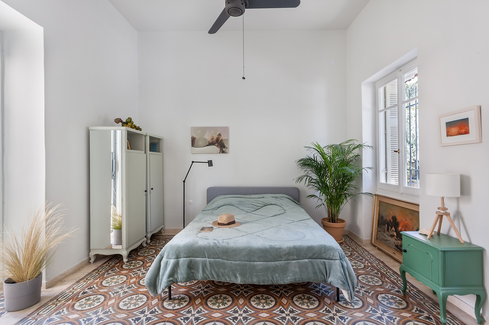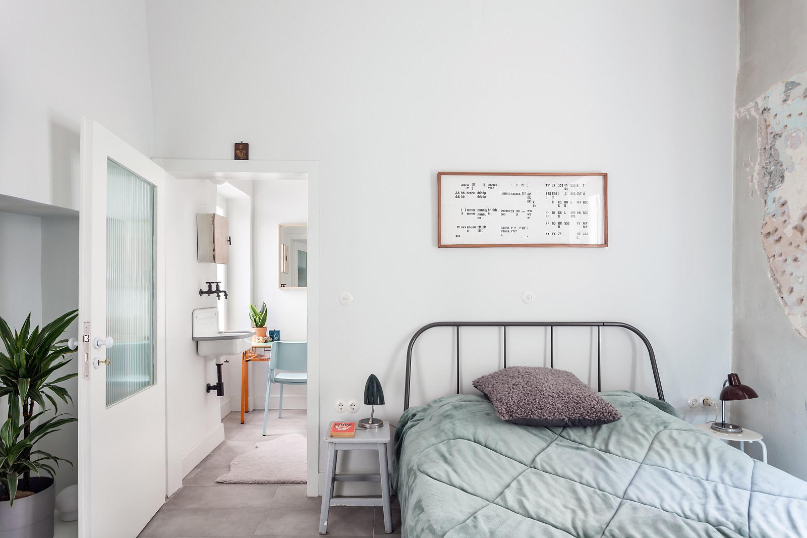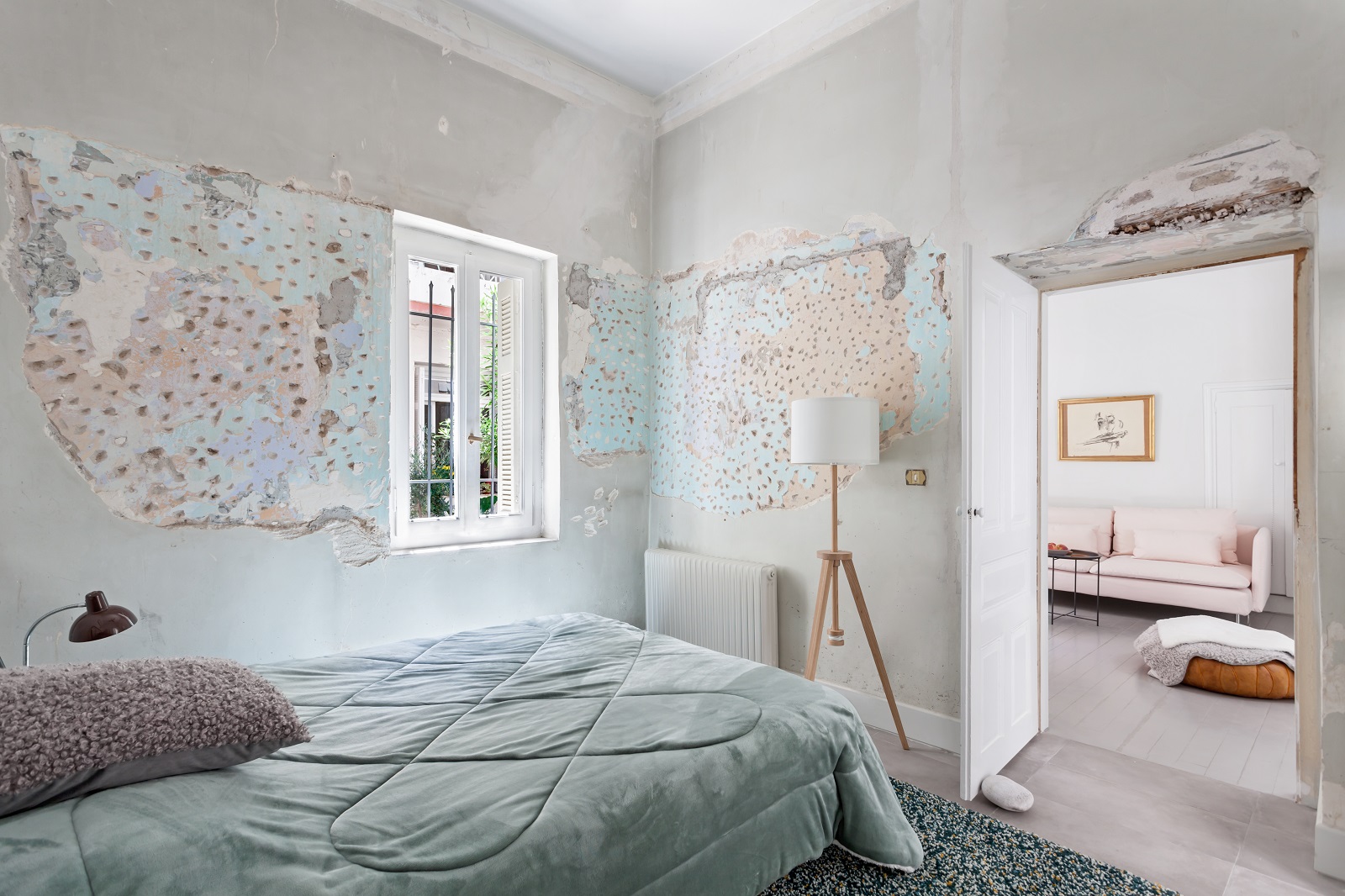 Στο υπνοδωμάτιο, τα αυθεντικά στοιχεία του σπιτιού αποκαλύπτονται ακόμα περισσότερο. Οι παλιές ξύλινες πόρτες, οι υφές των τοίχων και τα παραδοσιακά πλακάκια δημιουργούν μια ατμόσφαιρα που θυμίζει το παρελθόν του κτιρίου, ενώ τα σύγχρονα έπιπλα προσθέτουν άνεση και φρεσκάδα.