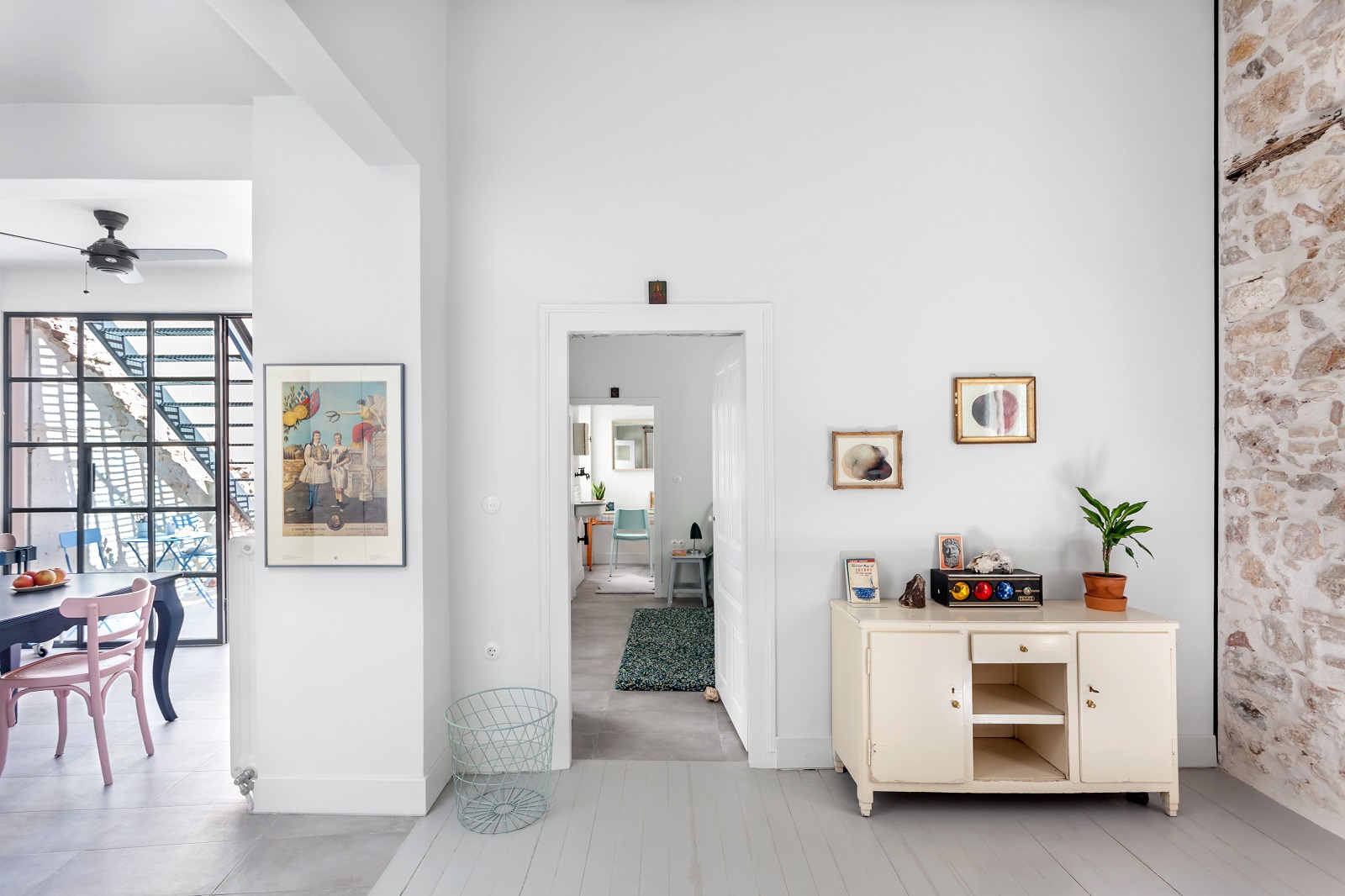 Στο εσωτερικό, η ανακαίνιση ισορροπεί ανάμεσα στο παλιό και το νέο, ενώ τα ψηλά ταβάνια και τα μεγάλα ανοίγματα γεμίζουν τους χώρους με φυσικό φως.