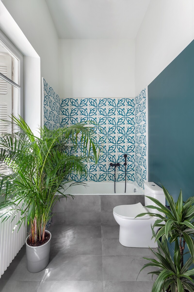 Στο δεύτερο σπίτι, τα παραδοσιακά πλακάκια στα πατώματα διατηρήθηκαν και συνδυάζονται με σύγχρονα έπιπλα και έντονες χρωματικές πινελιές, δημιουργώντας έναν χώρο ζεστό και φιλόξενο. Οι καθαρές λευκές επιφάνειες αναδεικνύουν την υφή των υλικών και επιτρέπουν στο φυσικό φως να κυριαρχεί.