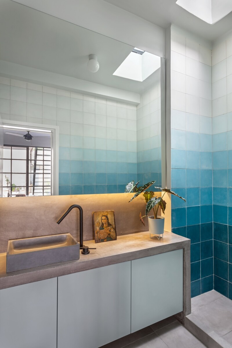Η κουζίνα και η τραπεζαρία διατηρούν την ίδια λογική απλότητας. Ένας μαρμάρινος νεροχύτης, που προέρχεται από κατεδαφισμένα σπίτια της περιοχής, τοποθετήθηκε πάνω σε μια νέα μεταλλική κατασκευή, συνδέοντας το παρελθόν με το παρόν του χώρου. Τα παστέλ χρώματα στα έπιπλα και τα vintage στοιχεία δίνουν μια χαλαρή, σχεδόν παιχνιδιάρικη αίσθηση.