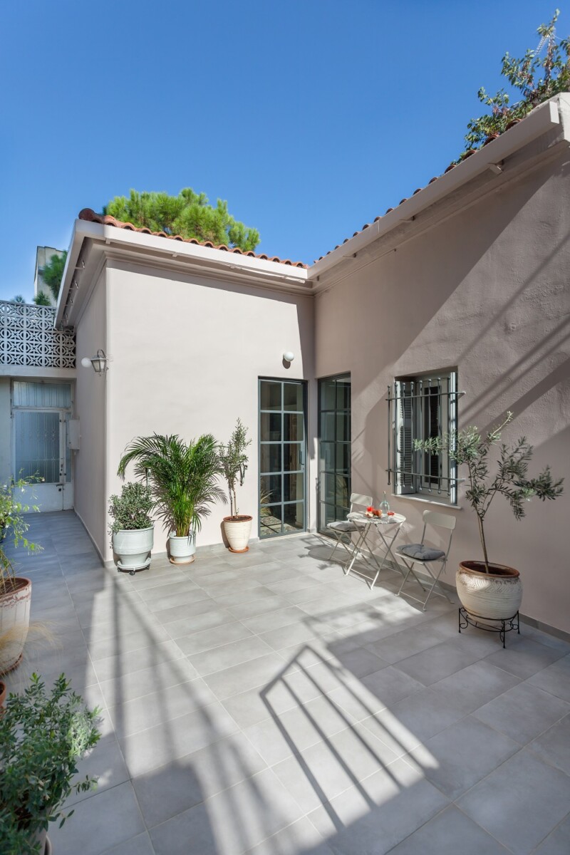 Η παλιά κτιστή σκάλα που οδηγούσε στην ταράτσα καταλάμβανε μεγάλο μέρος της εσωτερικής αυλής, περιορίζοντας τη χρήση της και εμποδίζοντας το φυσικό φως να μπει στο σπίτι.