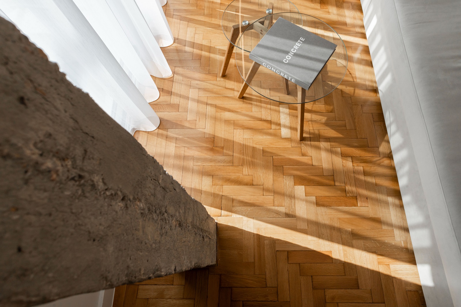 Το ελεύθερο σκυρόδετο υποστύλωμα και η δοκός του παραμένουν ανεπίχριστα, με την αδρή τους υφή να κυριαρχεί. Την παλέτα υλικών και χρωμάτων συμπληρώνουν το ξύλο, στη φυσική του απόχρωση και το λευκό χρώμα. Το ξύλινο δάπεδο και τα έπιπλα από εμφανές ξύλο αποκαθιστούν τη θαλπωρή που η οντολογία του κατοικείν αποζητά. Όσο για το λευκό, επιλέχθηκε τόσο για να αναδείξει τον καθρέφτη και το αδρό σκυροδέματος, όσο και και για να ενισχύσει τη φωτεινότητα του χώρου.