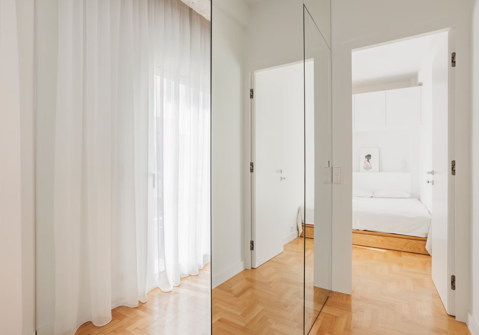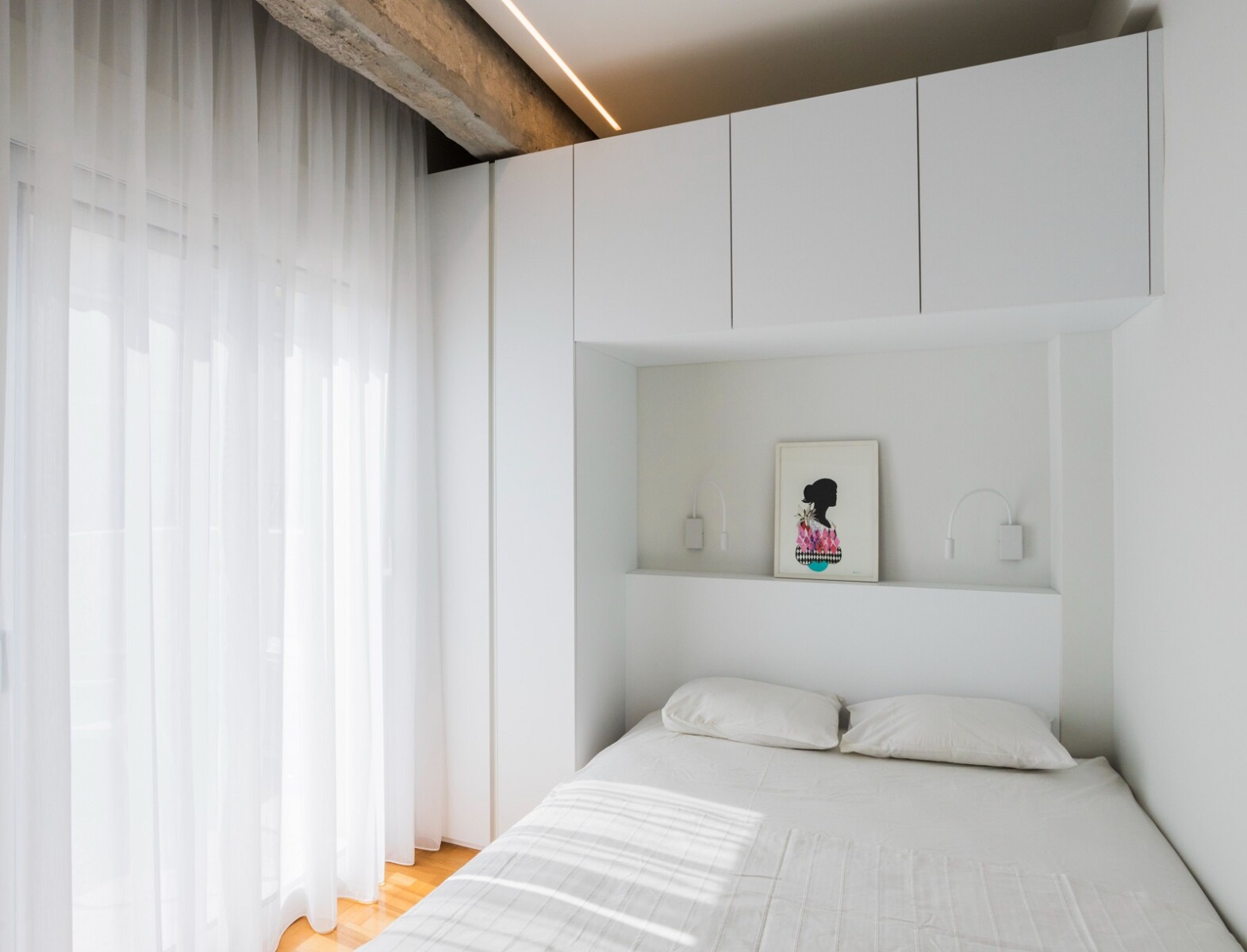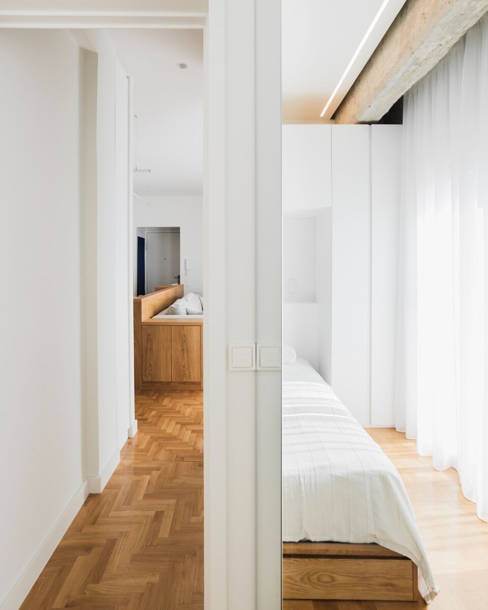 Στο υπνοδωμάτιο, το κρεβάτι σχεδιάζεται ως μέρος αποθηκευτικής σύνθεσης, με ράφι αντί κομοδίνου στη θέση του κεφαλαριού, ώστε να φιλοξενούνται όλες οι ανάγκες σε έναν χώρο που είναι αδύνατο να χωρέσει κρεβάτι, ντουλάπα και κομοδίνα ως διακριτά έπιπλα. Με το λευκό του χρώμα, εντάσσεται απόλυτα στο χώρο, σαν να ήταν πάντα εκεί, ενώ δεν επιβαρύνει το αισθητικό αποτέλεσμα.