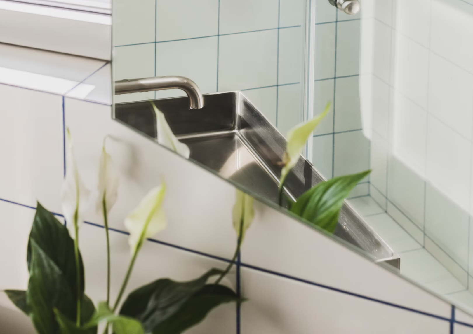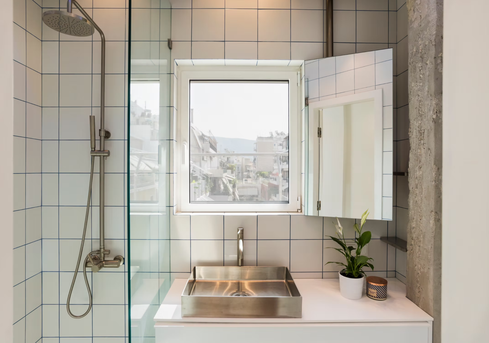 Η χαρακτηριστική επιλογή του μπλε χρώματος για τους αρμούς μεταξύ των πλακιδίων, απαντάται ξανά στον κύριο χώρο, στο χρώμα μιας μικρής αποθηκευτικής εσοχής και στην κουρτίνα που εξυπηρετεί ως είσοδός της.