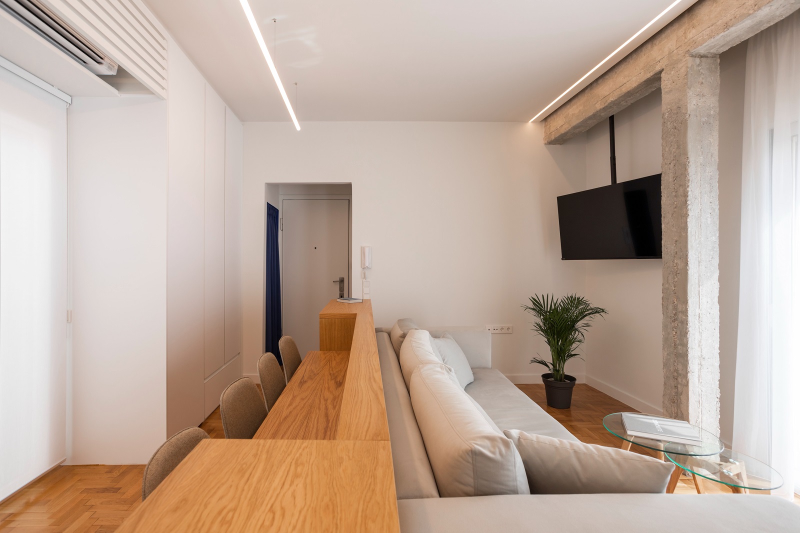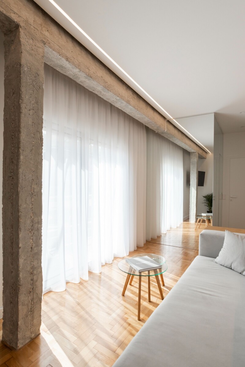 Δεδομένου του μεγέθους του ακινήτου, της θέσης και των διαστάσεων των ανοιγμάτων του, η επίπλωση σχεδιάστηκε με απόλυτη προσαρμογή στο χώρο.