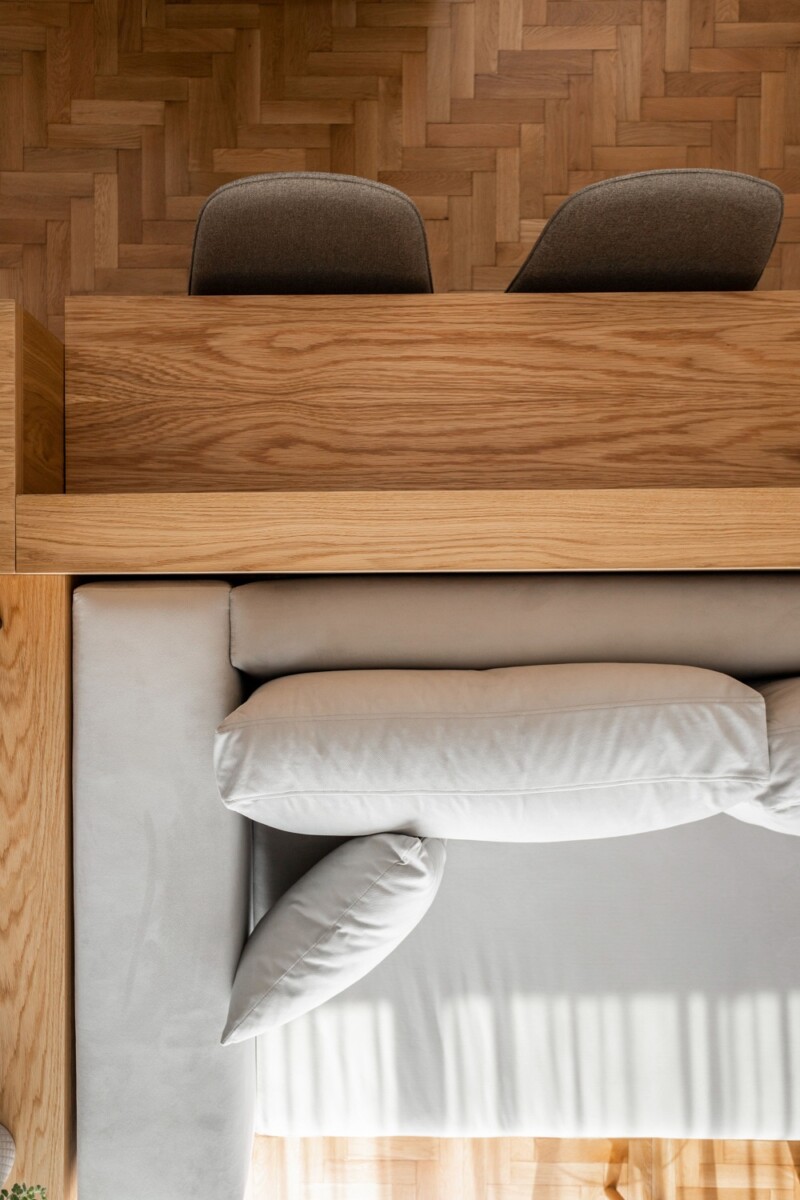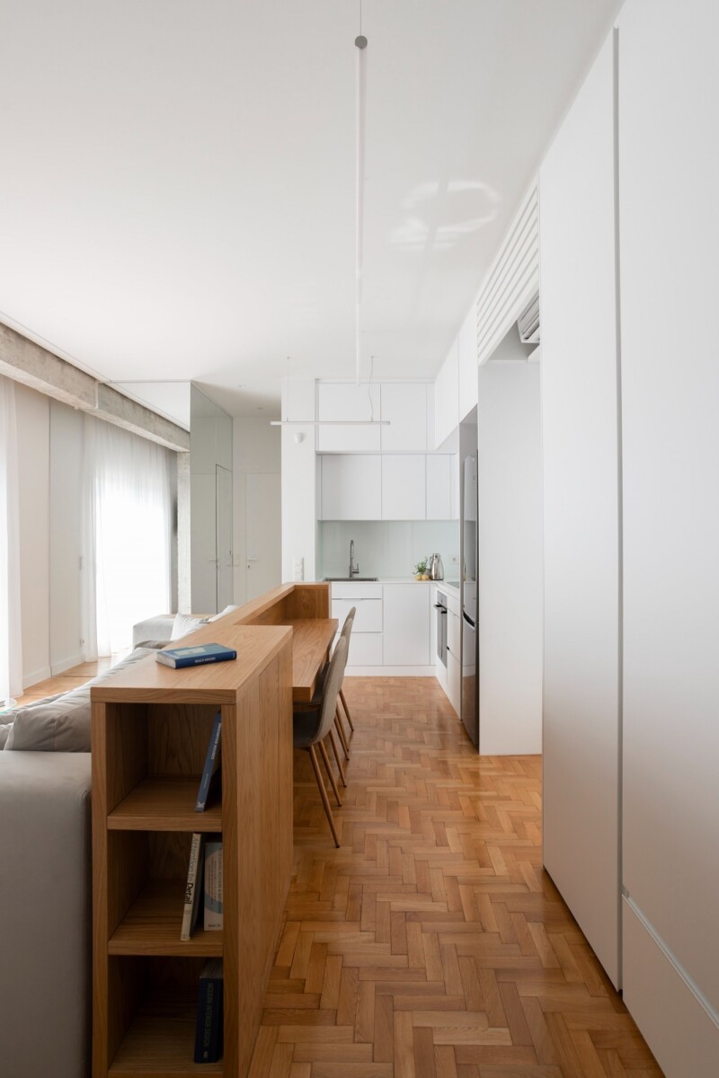 Από την πλευρά της κουζίνας λειτουργεί ως νησίδα, προσφέροντας πολύτιμη επιφάνεια εργασίας και χώρο αποθήκευσης. Συγχρόνως, χρησιμοποιείται ως πάγκος φαγητού ή γραφείο, εξυπηρετεί ως μικρή βιβλιοθήκη στο καθιστικό, με την τέταρτη έδρα του να αποτελεί την πλάτη του καναπέ – επίσης σχεδιασμένου ειδικά για τον συγκεκριμένο χώρο.