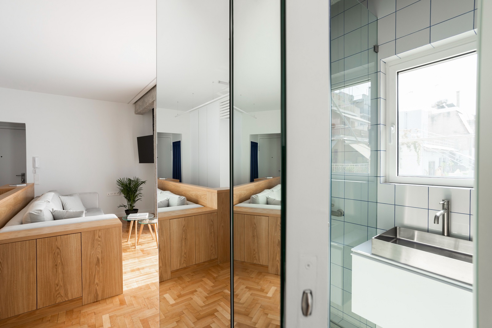 Έτσι εκκινείται η κεντρική ιδέα του σχεδιασμού: αποδυνάμωση των ορίων του χώρου, όχι με την έννοια της κατάργησης, αλλά σαν παιχνίδι ψευδαισθήσεων. Η ενέργεια που υλοποιεί αυτή την πρόθεση, είναι η επένδυση του πρισματικού όγκου του λουτρού με καθρέφτη, θέτοντας κάθε στοιχείο του χώρου σε μια λεπτή ισορροπία μεταξύ πραγματικότητας και ειδώλου.