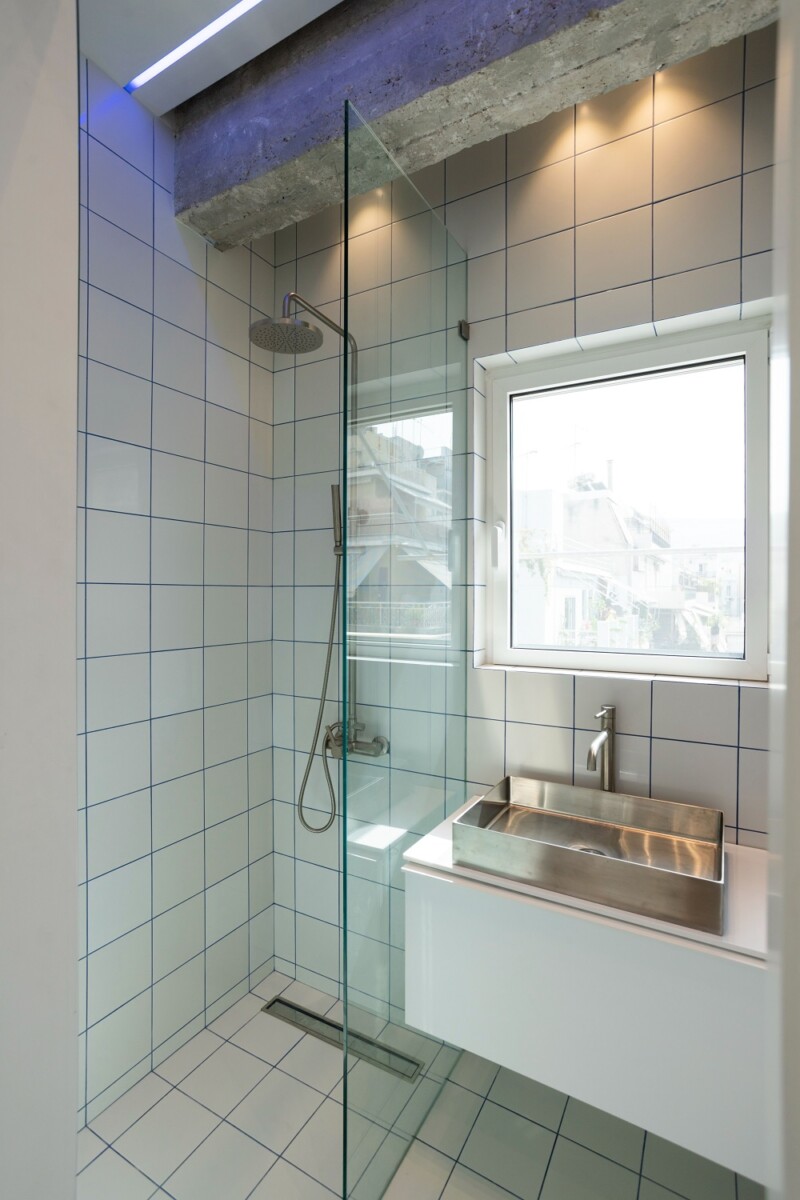 Το μονοχρωματικό αποτέλεσμα ολοκληρώνουν τα λευκά είδη υγιεινής και το έπιπλο, ενώ η έντονη παρουσία στοιχείων από ανοξείδωτο χάλυβα ενισχύει τη στιλπνότητα και εντείνει την αντίστιξη με την αδρότητα της δοκού σκυροδέματος που διατρέχει και το λουτρό.
