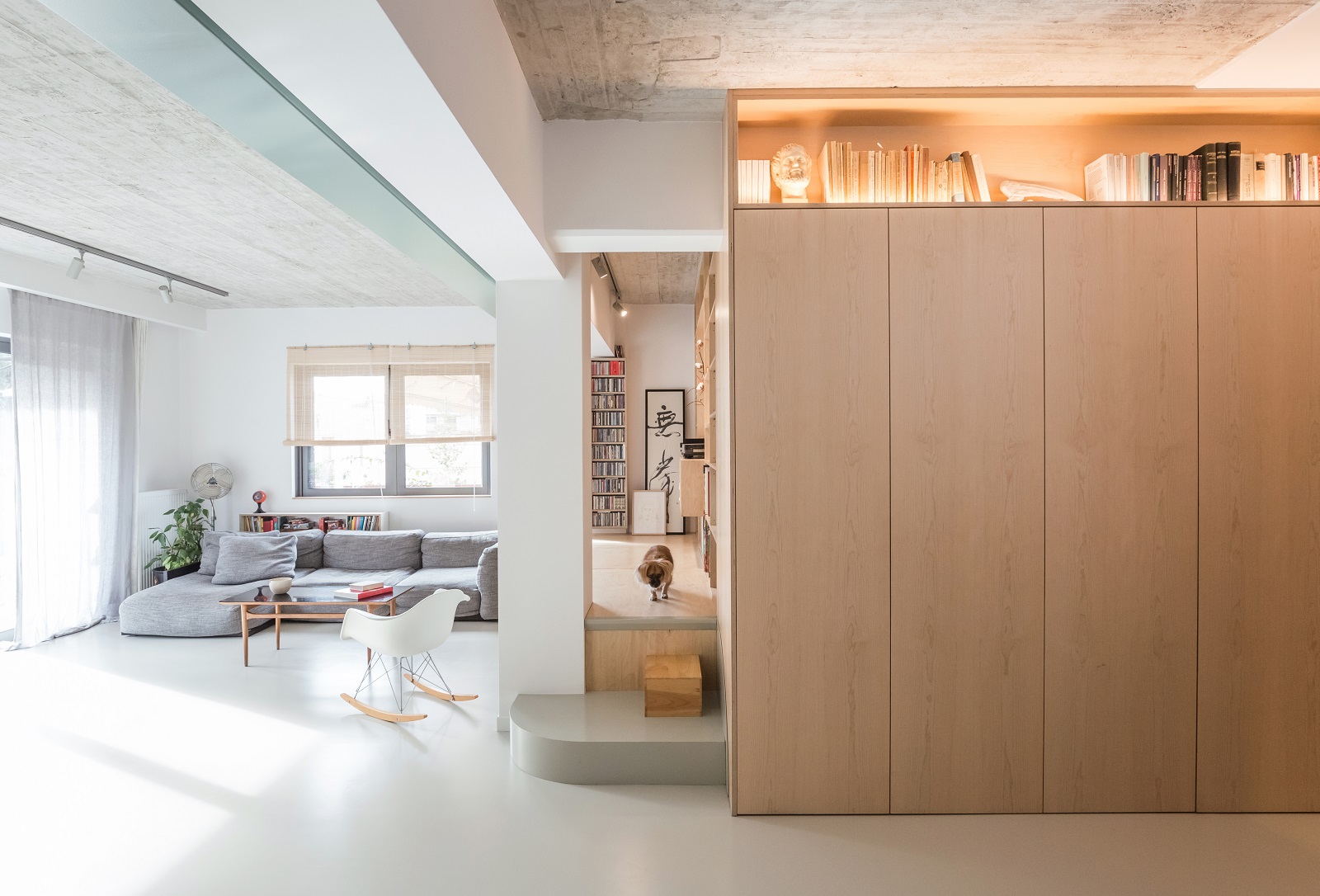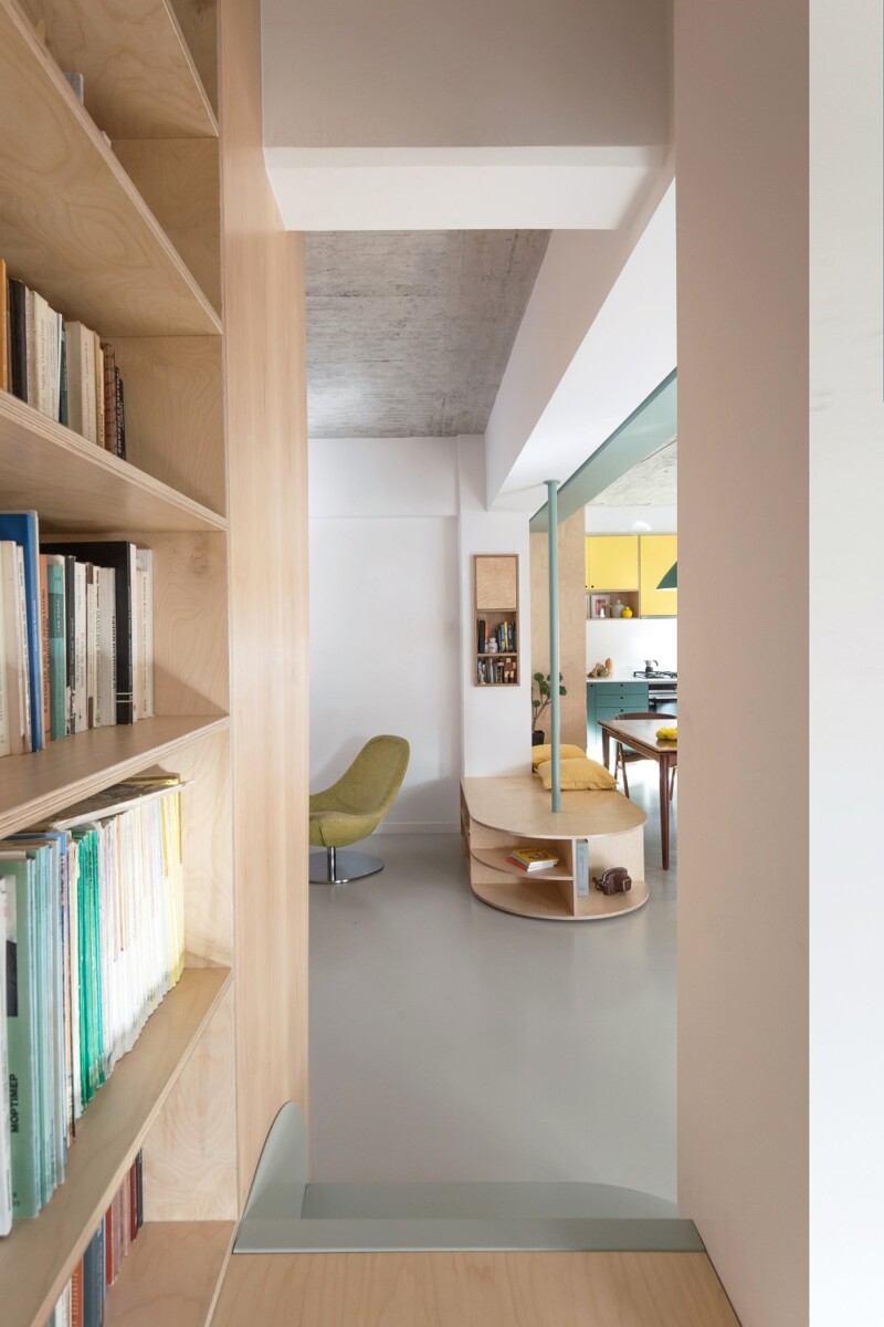 Έτσι, ο σχεδιασμός του διαμερίσματος οργανώθηκε πάνω σε δύο «ανατροπές»: τα επιμέρους δωμάτια αντιμετωπίστηκαν ως ένα ενιαίο και ενοποιητικό στοιχείο και ο αποθηκευτικός χώρος (συνήθως κρυμμένος πάνω από το λουτρό – το πατάρι) τοποθετήθηκε κεντρικά, στο καθιστικό.