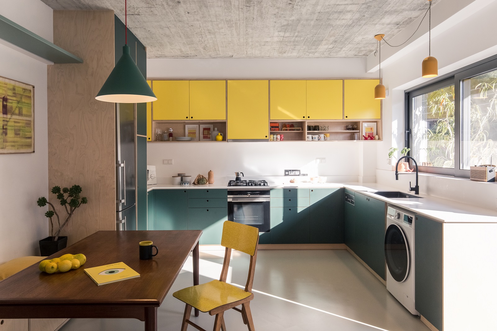 Στην κουζίνα οι ξύλινες επιφάνειες εμπλουτίζονται με χρώμα στις επιφάνειες των ντουλαπιών.