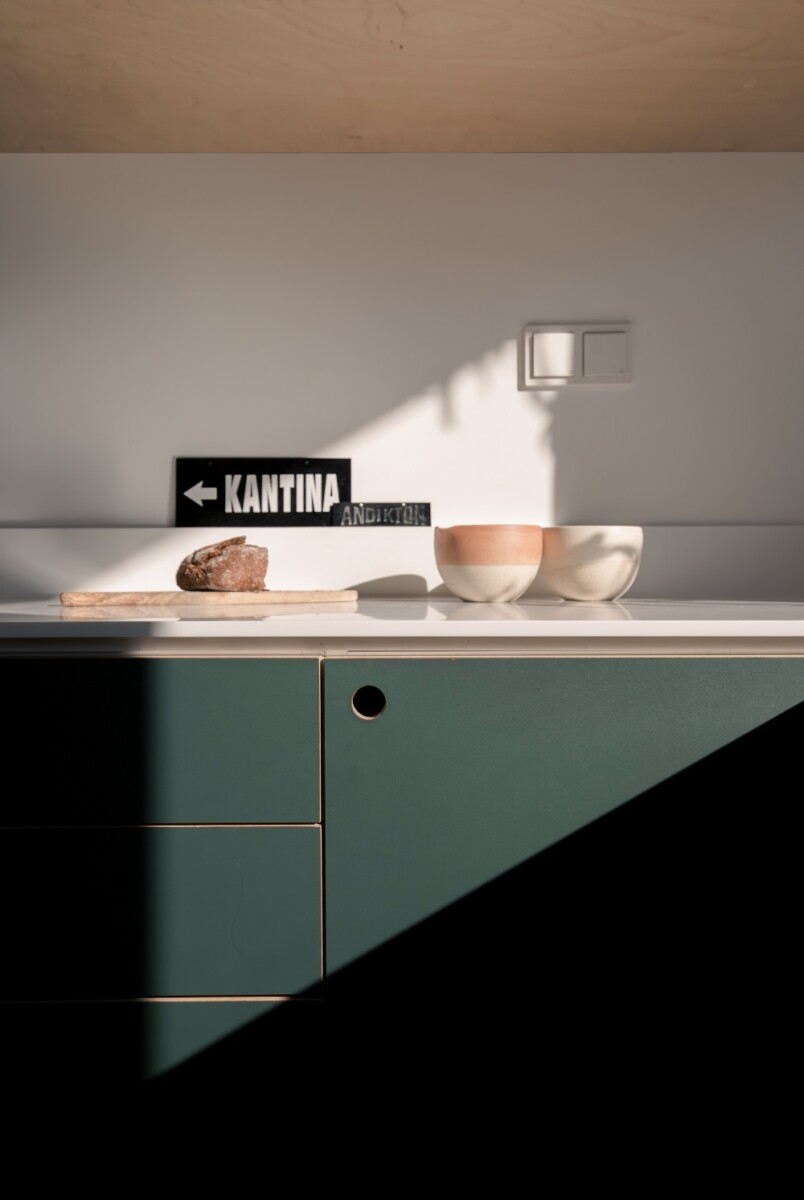 Οι ξύλινες επιφάνειες από κόντρα πλακέ λειτουργούν ως μία οριζόντια ζώνη μεταξύ της αδρής επιφάνειας του σκυροδέματος στην οροφή και του νέου ενιαίου και ομοιόμορφου δαπέδου.