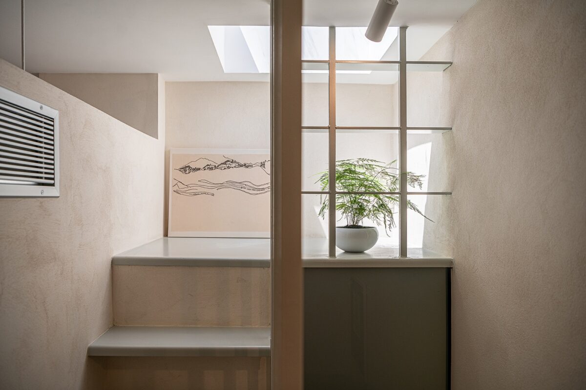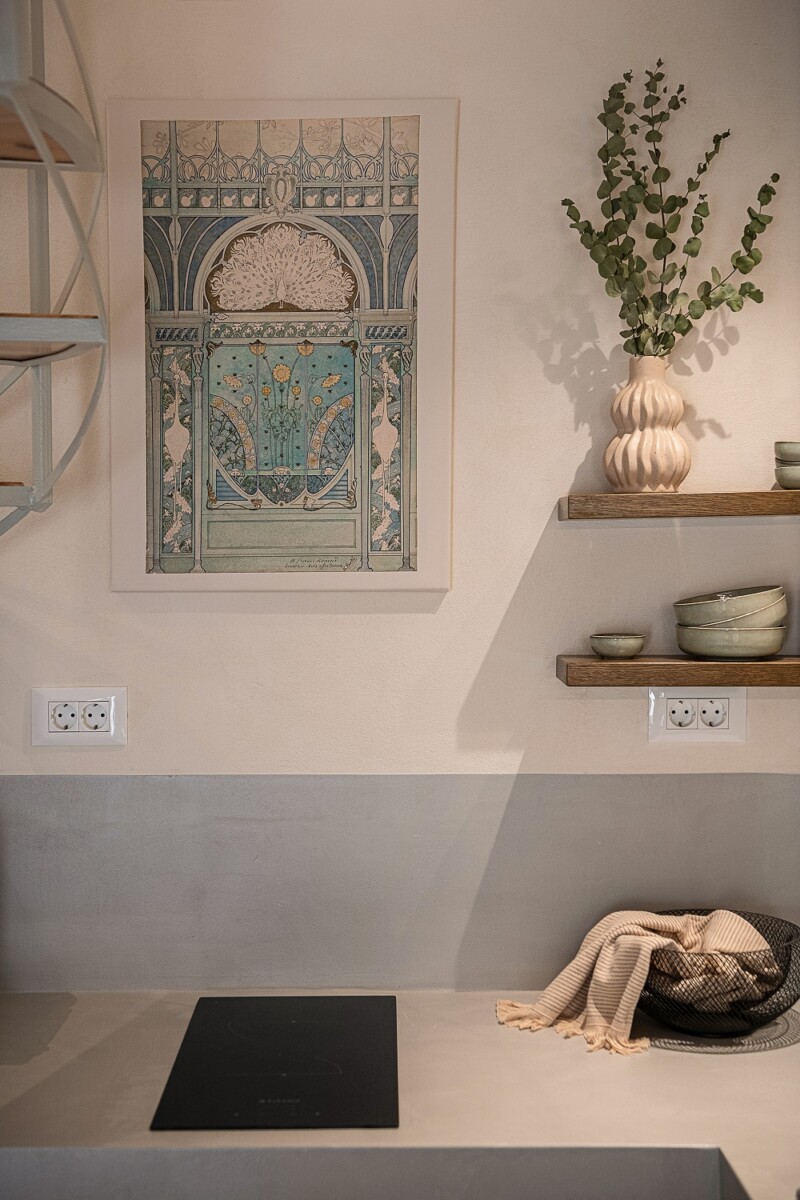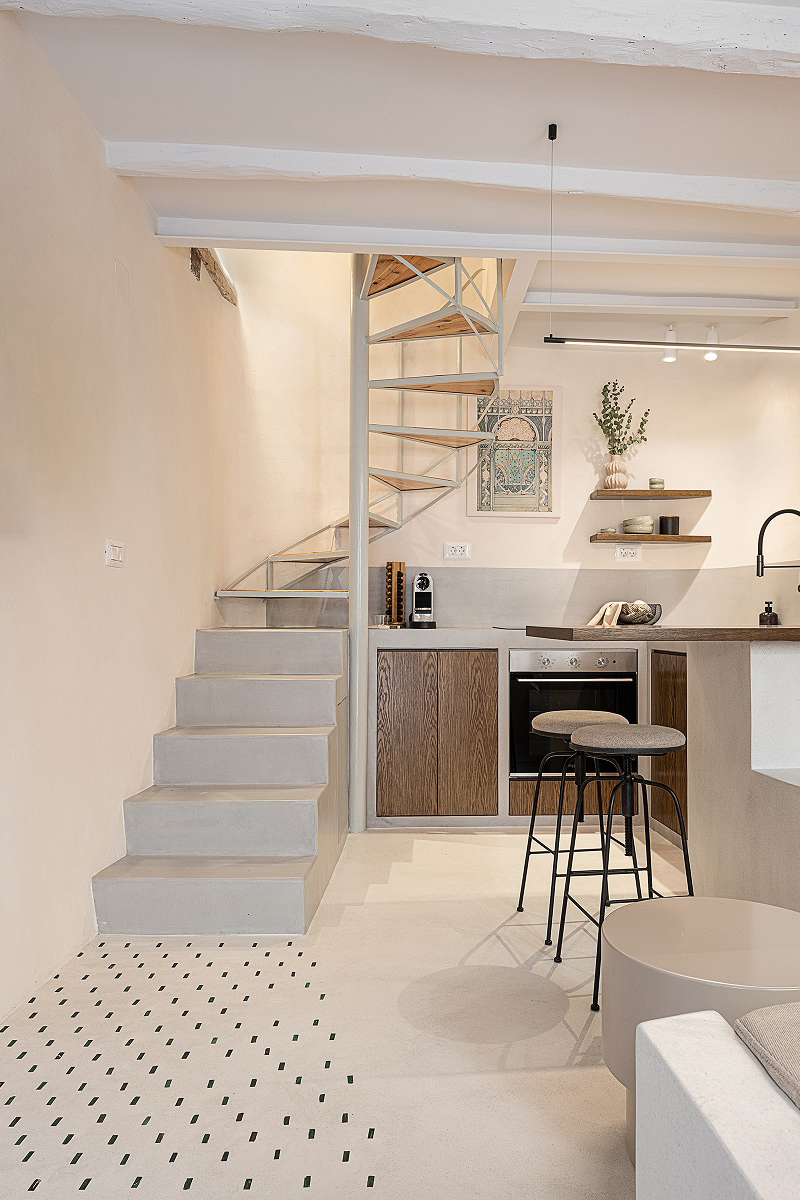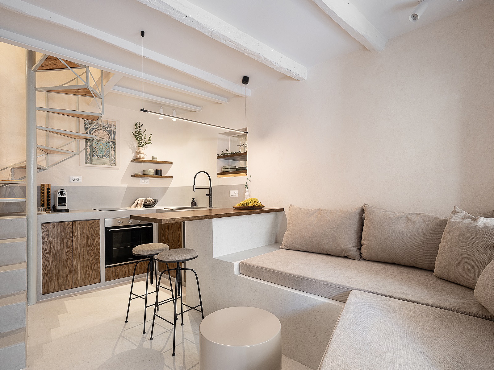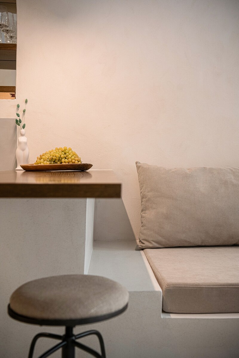 Το μικρό εμβαδό των 24 τ.μ. ήταν μια πρόκληση. Για οικονομία στον χώρο, η κουζίνα και ο καθιστικός χώρος,  κατασκευάστηκαν ως σταθερά στοιχεία με επίστρωση τσιμεντοκονιάματος.