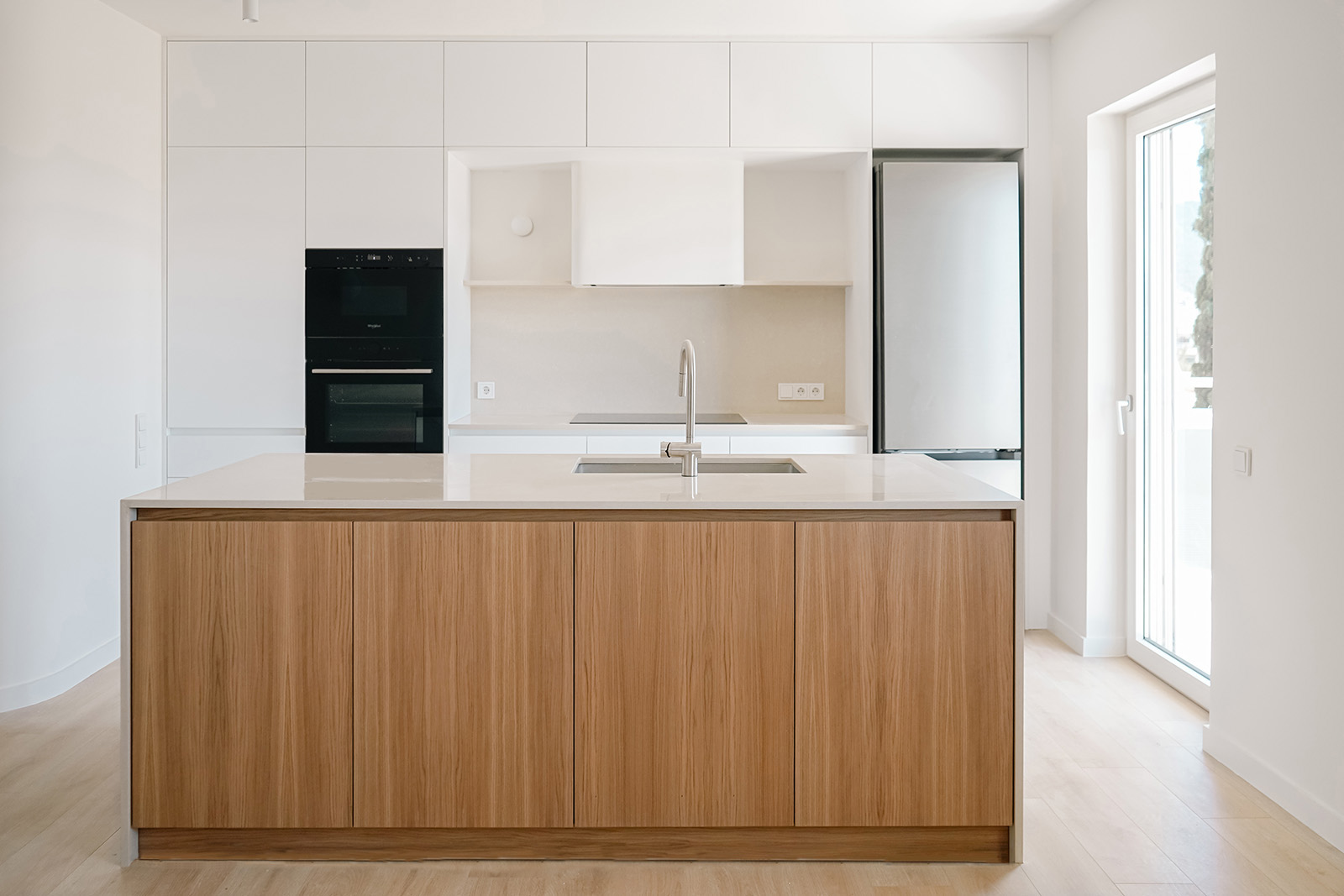 Σε όλο το διαμέρισμα, το δάπεδο καλύφθηκε από laminate σε απόχρωση ανοιχτού δρυ. Στην κουζίνα επιλέχθηκε ένας διακριτικός χαλαζίας σε μπεζ απόχρωση που συμπλήρωσε τη γήινη παλέτα.