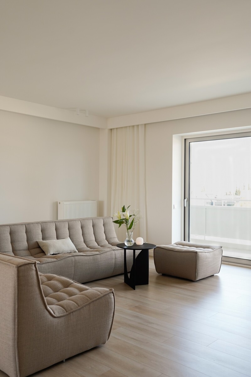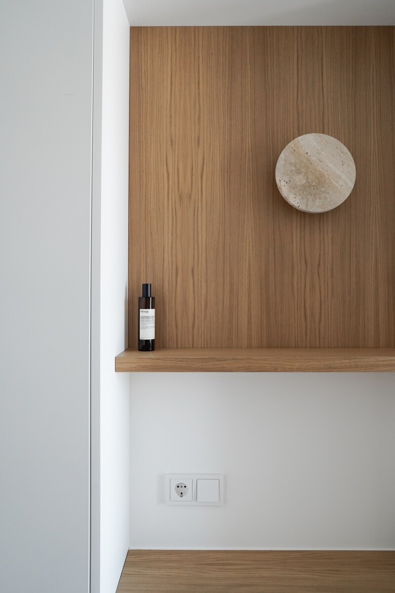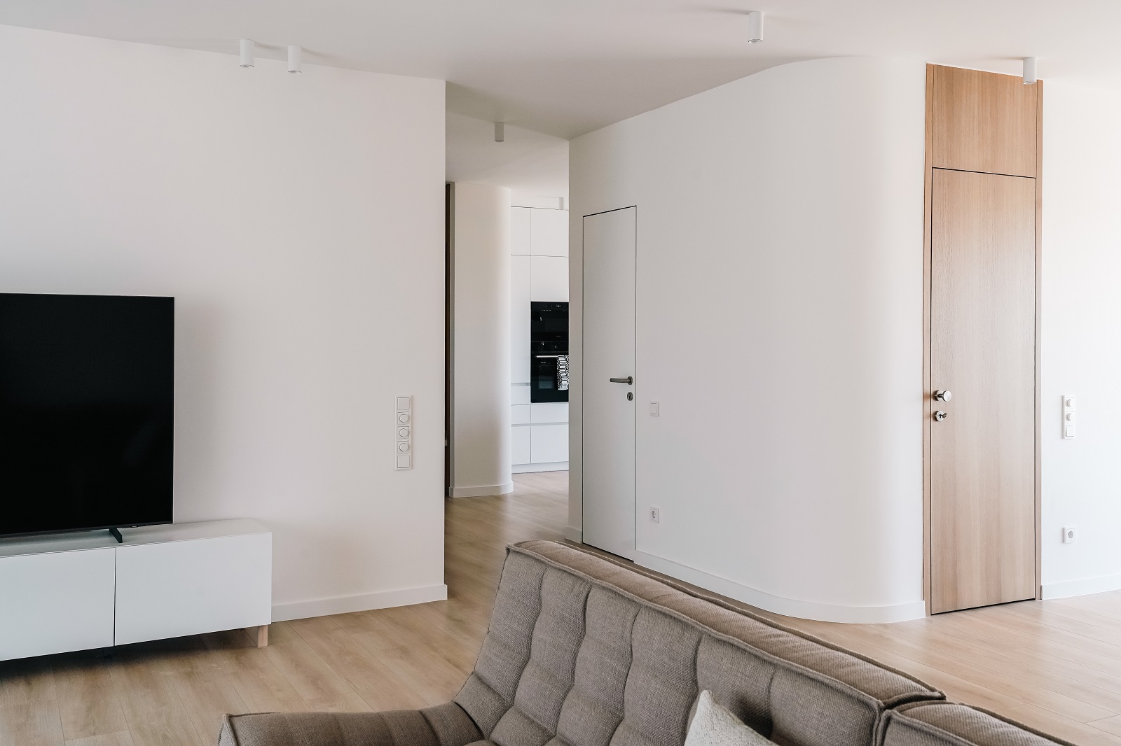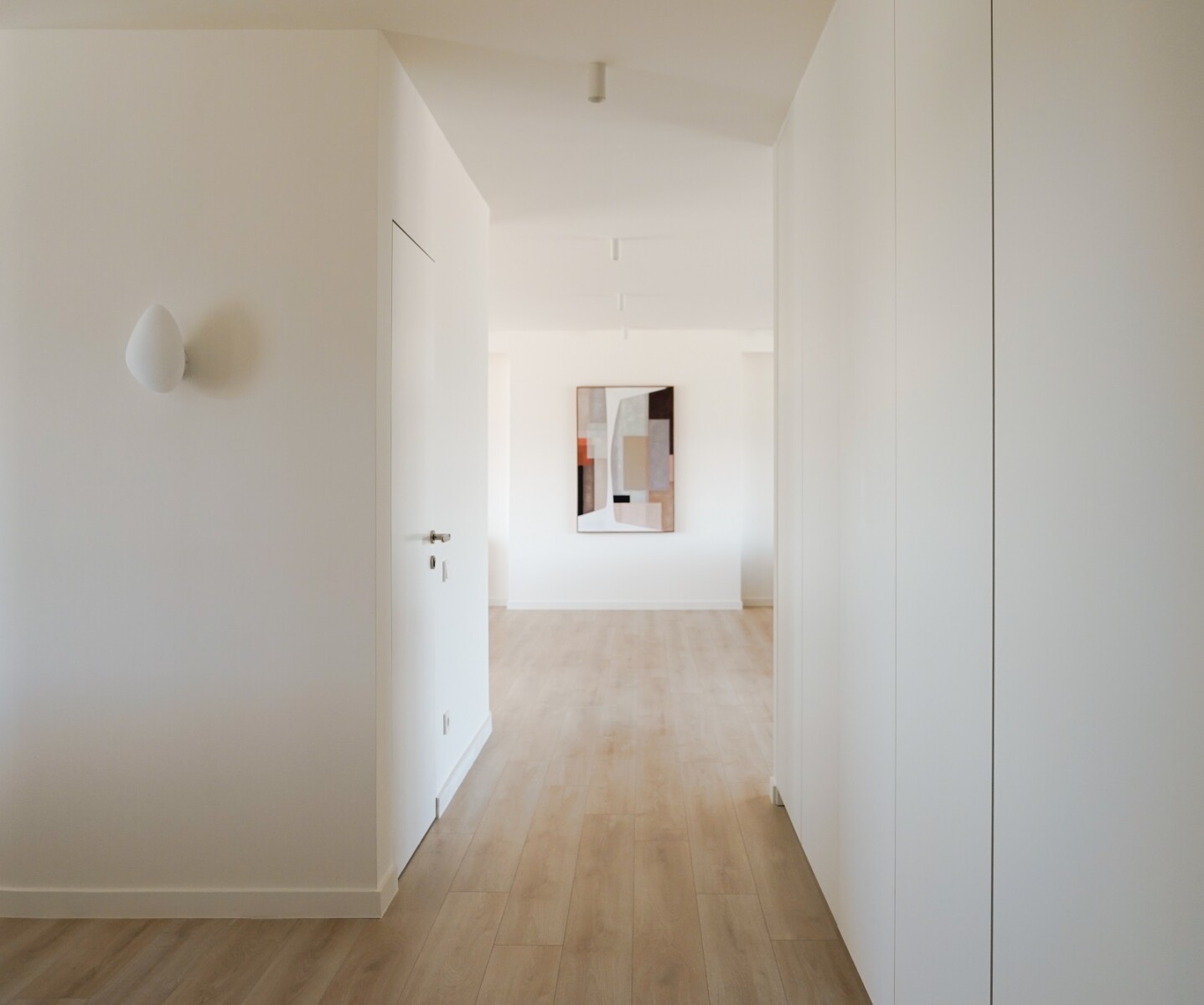 Επιθυμία των ιδιοκτητών ήταν ένα ήρεμο και minimal αισθητικό αποτέλεσμα. Γι’ αυτόν τον λόγο επιλέχθηκαν εντοιχισμένες ντουλάπες, κρυφόπορτες και ξυλουργικά στην ίδια off white απόχρωση με τους τοίχους.