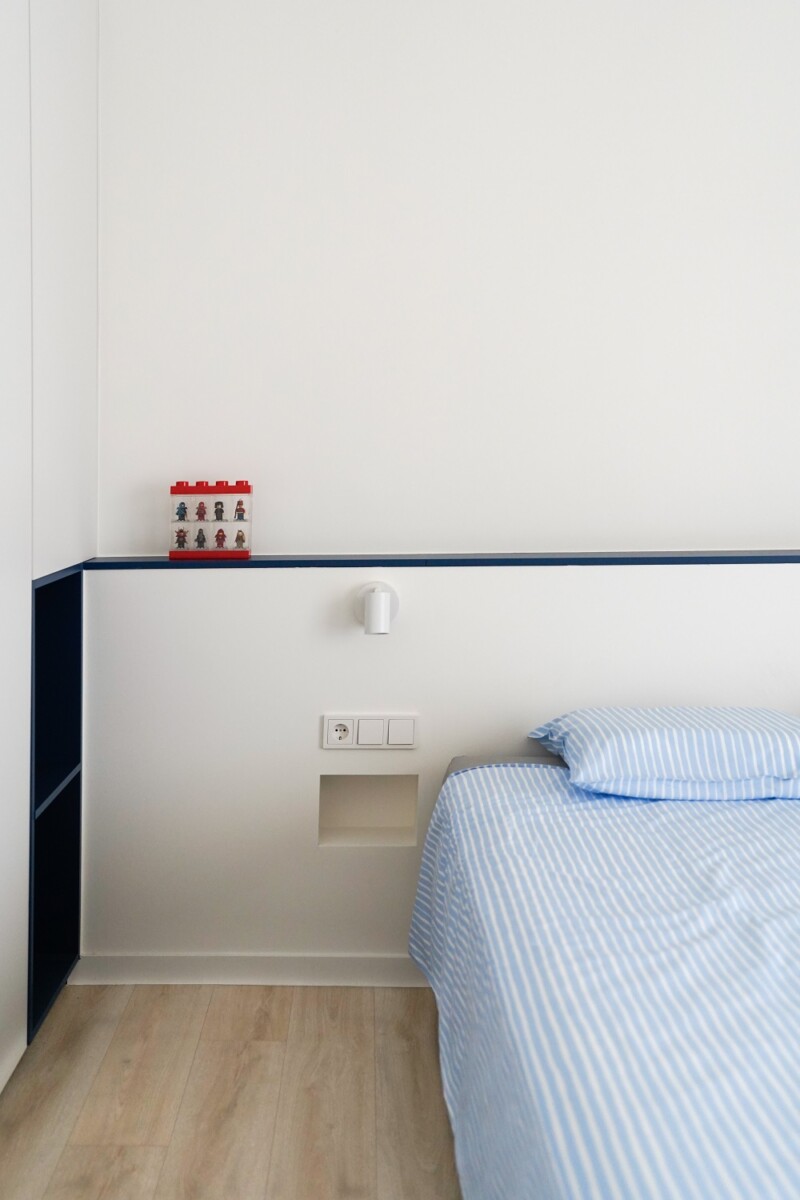 Η κύρια κρεβατοκάμαρα ακολούθησε αυτή τη χρωματική παλέτα, με πλακάκι με όψη travertino στο λουτρό της, ενώ η δεύτερη κρεβατοκάμαρα διαφοροποιήθηκε με έντονο το μπλε στοιχείο – τόσο στα ξυλουργικά του όσο και στο χώρο του λουτρού.