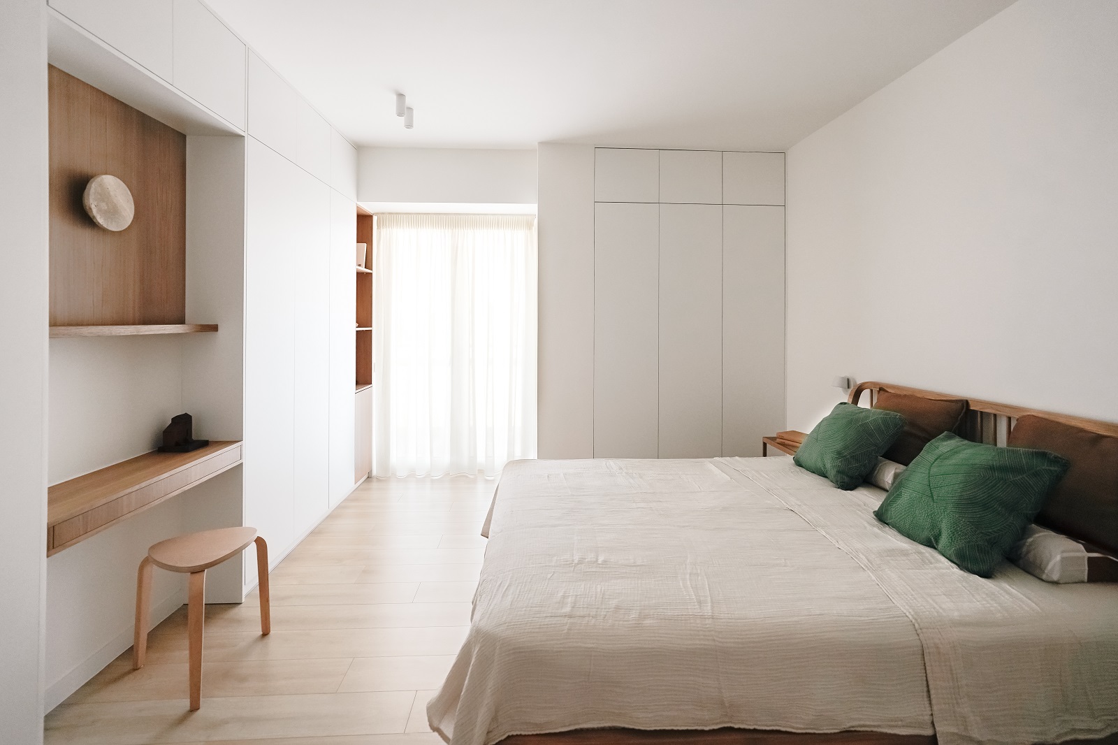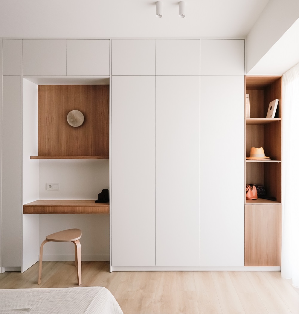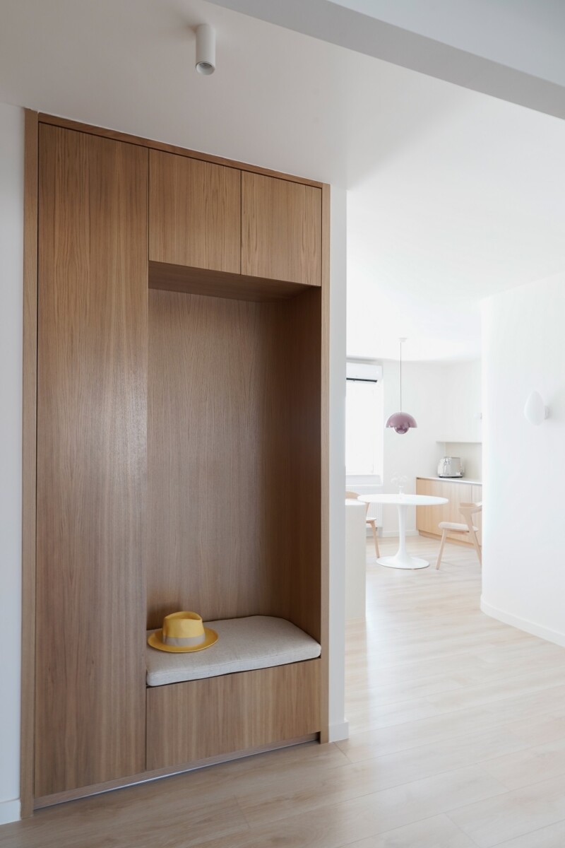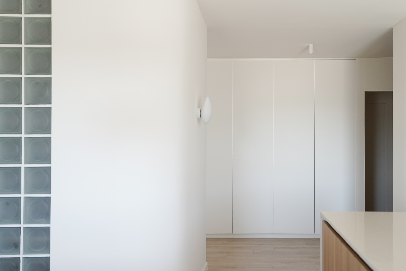 Επιθυμία των ιδιοκτητών ήταν ένα ήρεμο και minimal αισθητικό αποτέλεσμα. Γι' αυτόν τον λόγο επιλέχθηκαν από την αρχιτέκτονα Κατερίνα Σελέκου εντοιχισμένες ντουλάπες, κρυφόπορτες και ξυλουργικά στην ίδια off white απόχρωση με τους τοίχους.