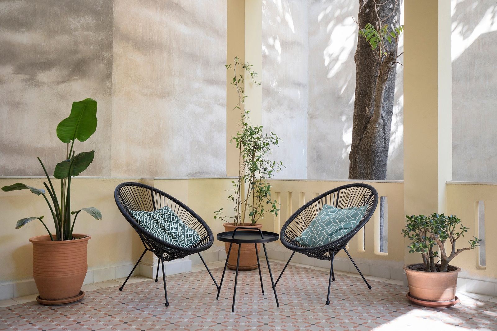 Ζητούμενο του σχεδιασμού ήταν να δημιουργηθεί μια αλληλουχία από τους τέσσερις χώρους που βρίσκονται επί της οδού Εμπεδοκλέους: χώρος γραφείου, τραπεζαρία, σαλόνι και η μεγάλη βεράντα.