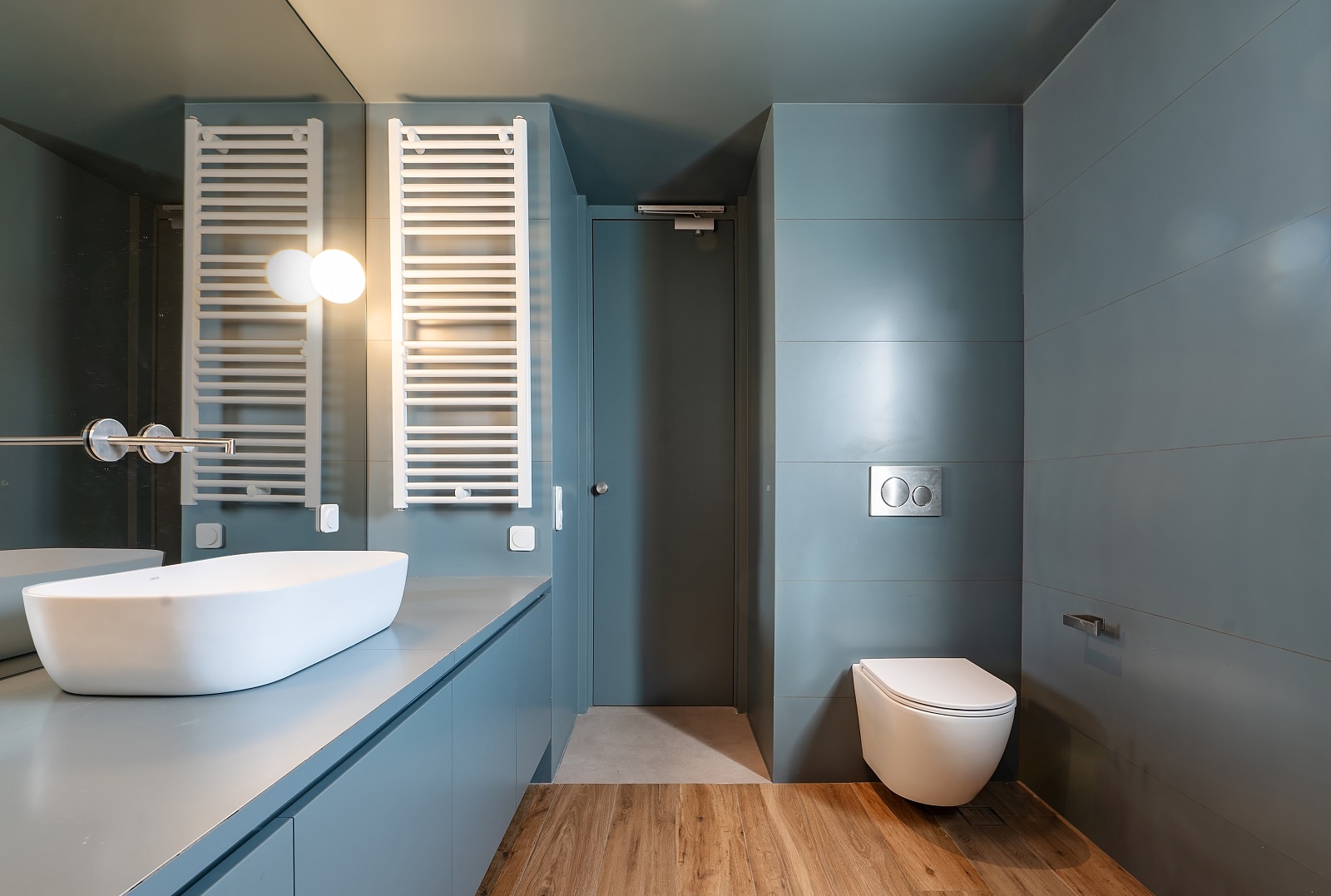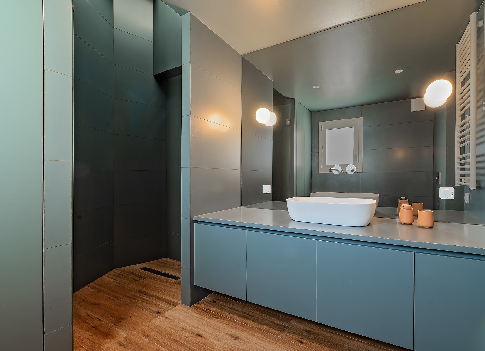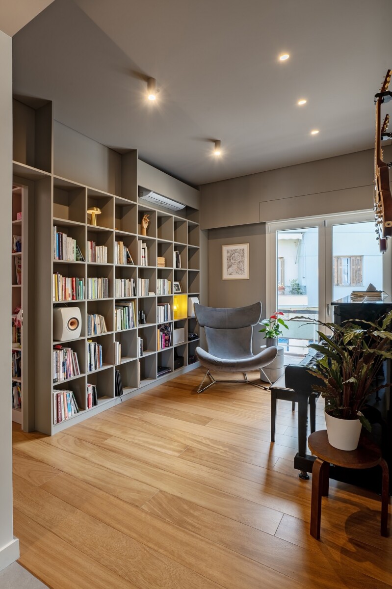 Το δάπεδο από ξύλο ιρόκο καλύπτει όλους τους χώρους του διαμερίσματος, με εξαίρεση μια νησίδα πλακιδίων στην περιοχή της εισόδου και της κουζίνας, όπου το ίδιο ξύλο χρησιμοποιείται και στην επένδυση των χαμηλών επίπλων της κουζίνας αποκτώντας έτσι τρισδιάστατη έκφανση στο χώρο.