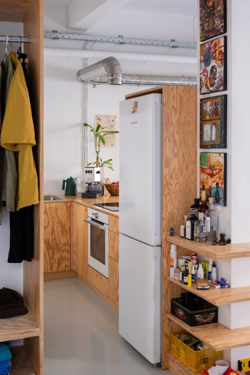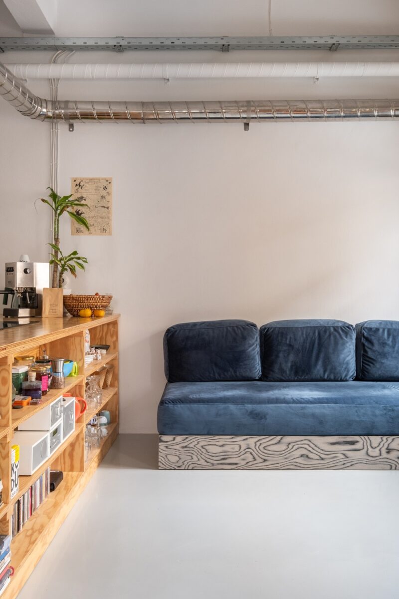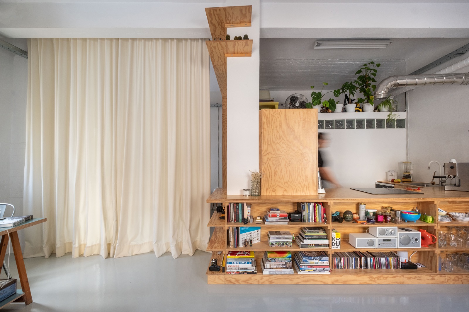 Κεντρικό στοιχείο του διαμερίσματος είναι το διαχωριστικό έπιπλο από κόντρα πλακέ πεύκου, που λειτουργεί ως κουζίνα, βιβλιοθήκη και ντουλάπα, ενώ διαχωρίζει τον χώρο της κουζίνας και του μπάνιου από το υπόλοιπο διαμέρισμα.
