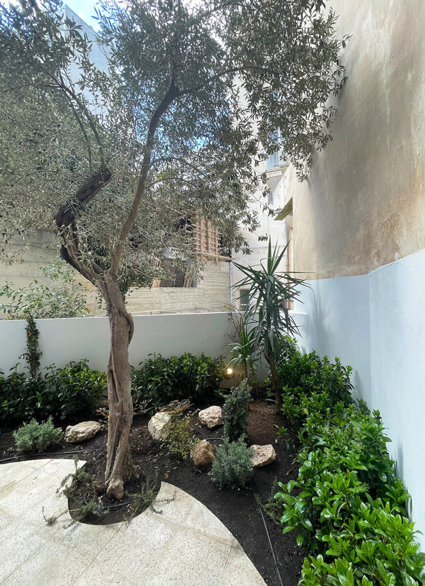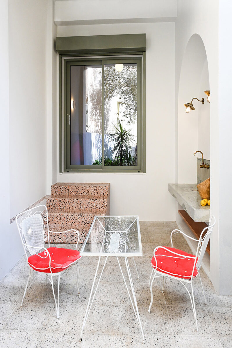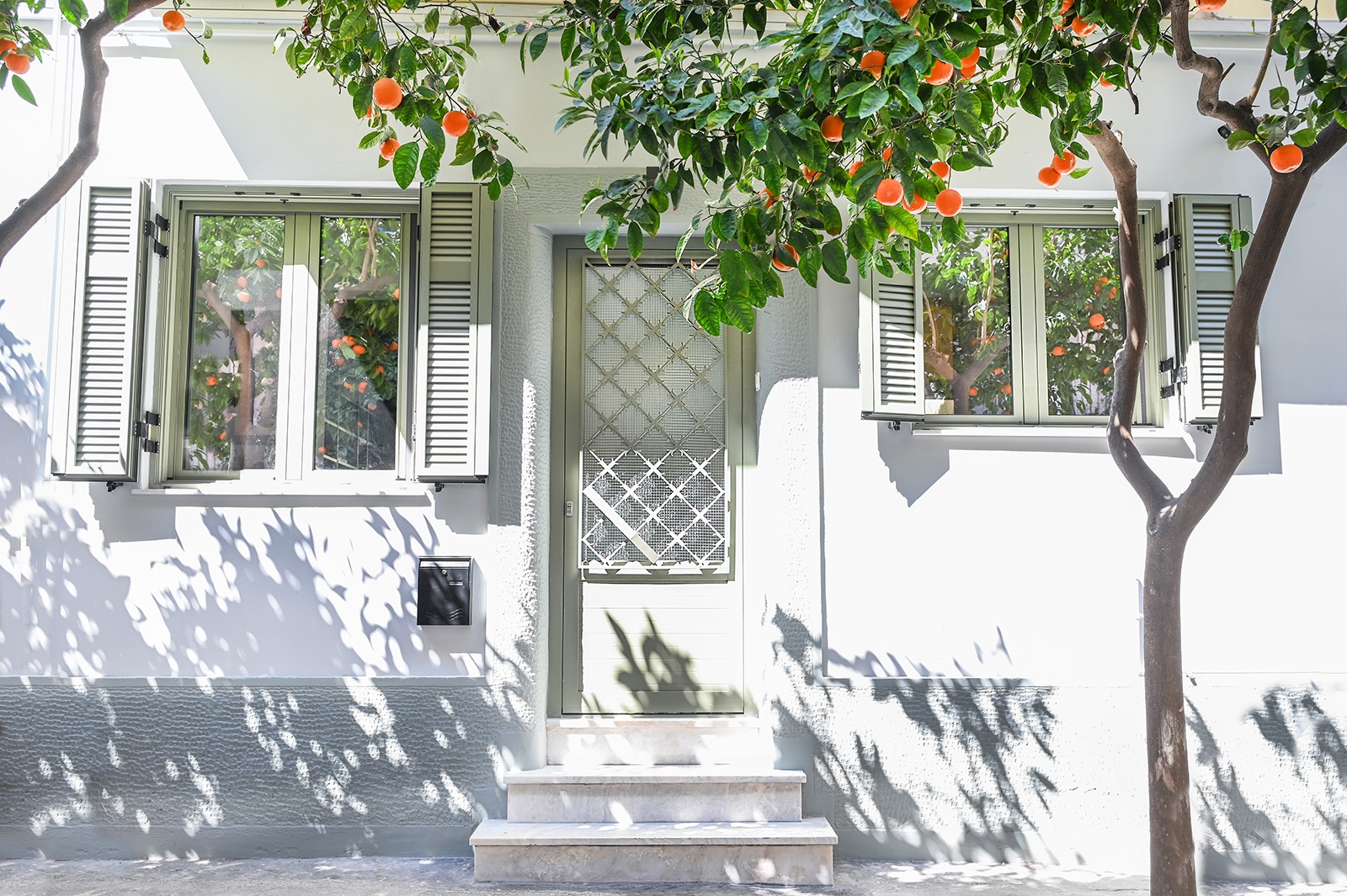Το πυκνό φύλλωμα των νεραντζιών της πρόσοψης και η εσωτερική αυλή, περικυκλωμένη από τους γύρω ακάλυπτους, συνθέτουν ένα σκηνικό περιαστικό, μέσα στην καρδιά της πόλης.